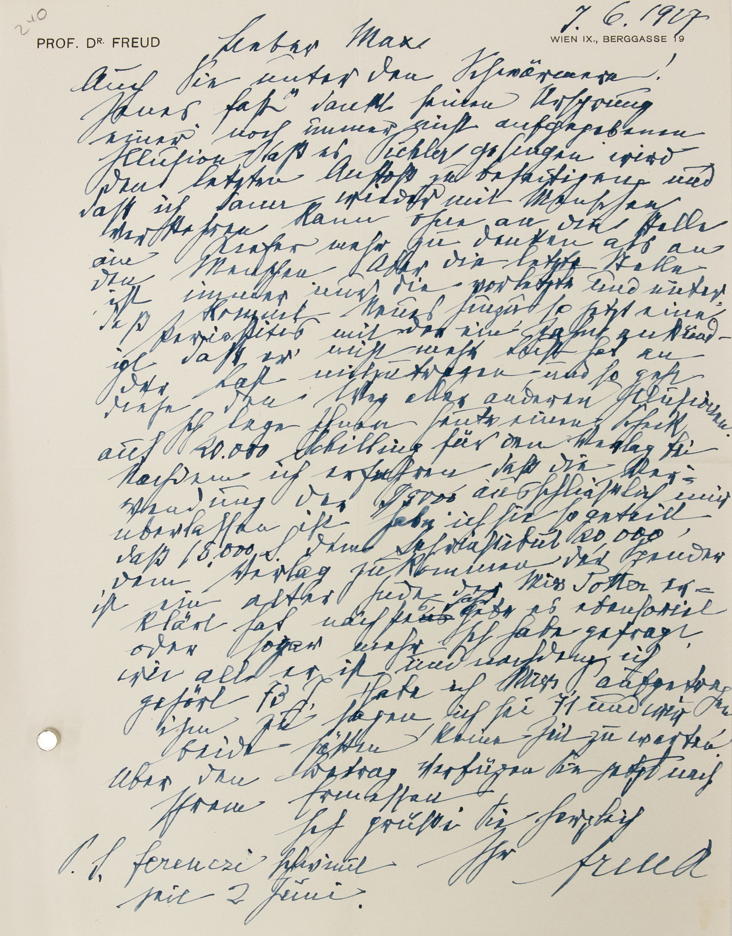 Ich lege Ihnen heute einen Scheck auf 20.000 Schilling für den Verlag bei. Nachdem ich erfahren, daß die Verwendung der $ 5000 ausschließlich mir überlassen ist, habe ich sie so geteilt, daß 15.000 S. dem Lehrinstitut, 20.000 dem Verlag zukommen. Der Spender ist ein alter Jude, der Miss Potter2 erklärt hat, nächstes Jahrc gebe es ebensoviel oder sogar mehr. Ich habe gefragt, wie alt er ist, und nachdem ich gehört, 73 Jahre, habe ich Miss P. aufgetragen, ihm zu sagen, ich sei 71, und wir beide hätten keine Zeit zu warten. Über den Betrag verfügen Sie jetzt nach Ihrem Ermessen.