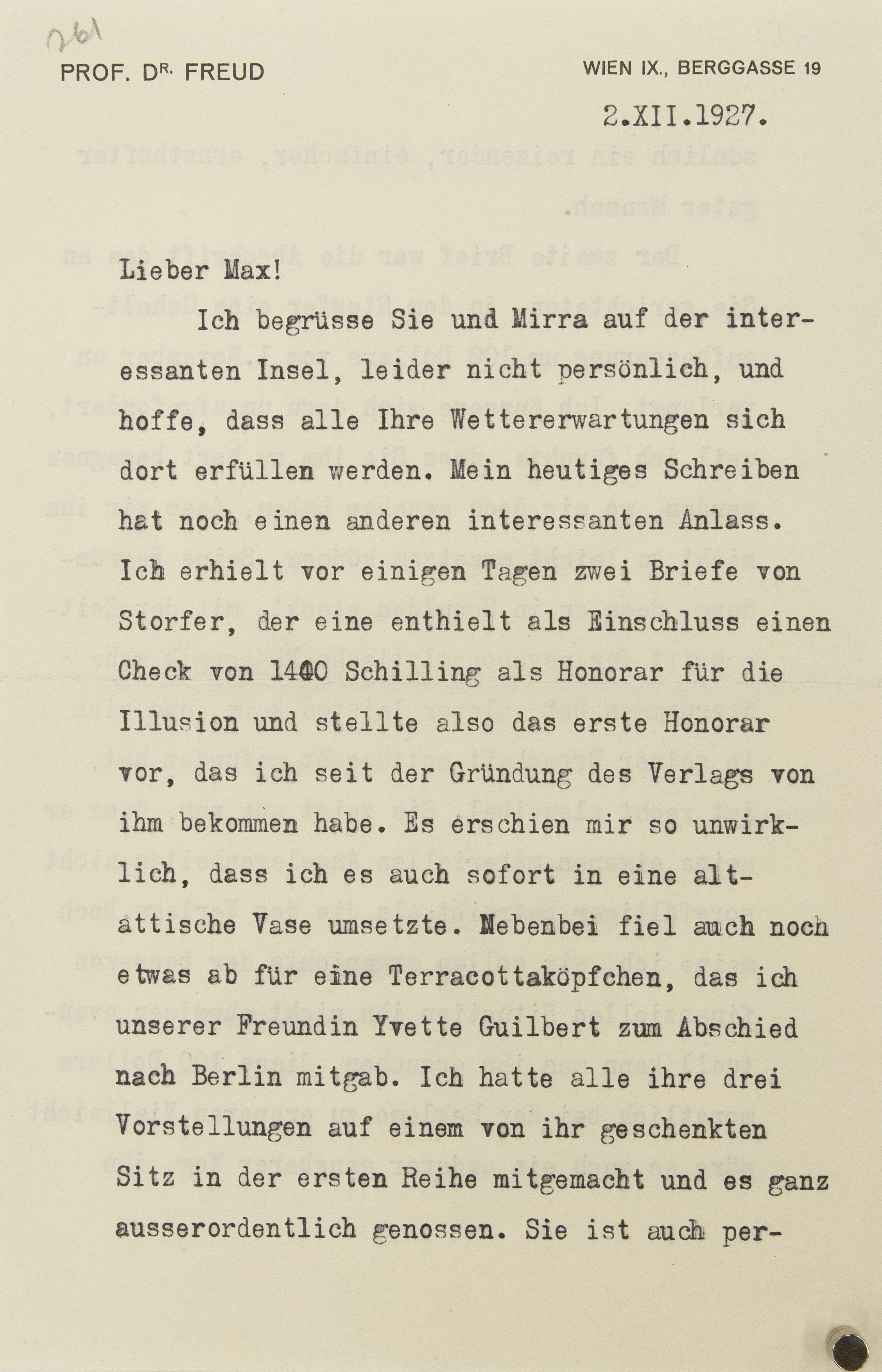 Ich begrüße Sie und Mirra auf der interessanten Insel,1 leider nicht persönlich, und hoffe, daß alle Ihre Wettererwartungen sich dort erfüllen werden. Mein heutiges Schreiben hat noch einen anderen interessanten Anlaß. Ich erhielt vor einigen Tagen zwei Briefe von Storfer, der eine enthielt als Einschluß einen Scheck von 1400 Schilling als Honorar für die ‚Illusion‘ und stellte also das erste Honorar vor, das ich seit der Gründung des Verlags von ihm bekommen habe. Es erschien mir so unwirklich, daß ich es auch sofort in eine alt-attische Vase umsetzte. Nebenbei fiel auch noch etwas ab für ein Terrakottaköpfchen, das ich unserer Freundin Yvette Guilbert2 zum Abschied nach Berlin mitgab. Ich hatte alle ihre drei Vorstellungen auf einem von ihr geschenkten Sitz in der ersten Reihe mitgemacht und es ganz außerordentlich genossen. Sie ist auch persönlich ein reizender, einfacher, ernsthafter guter Mensch.