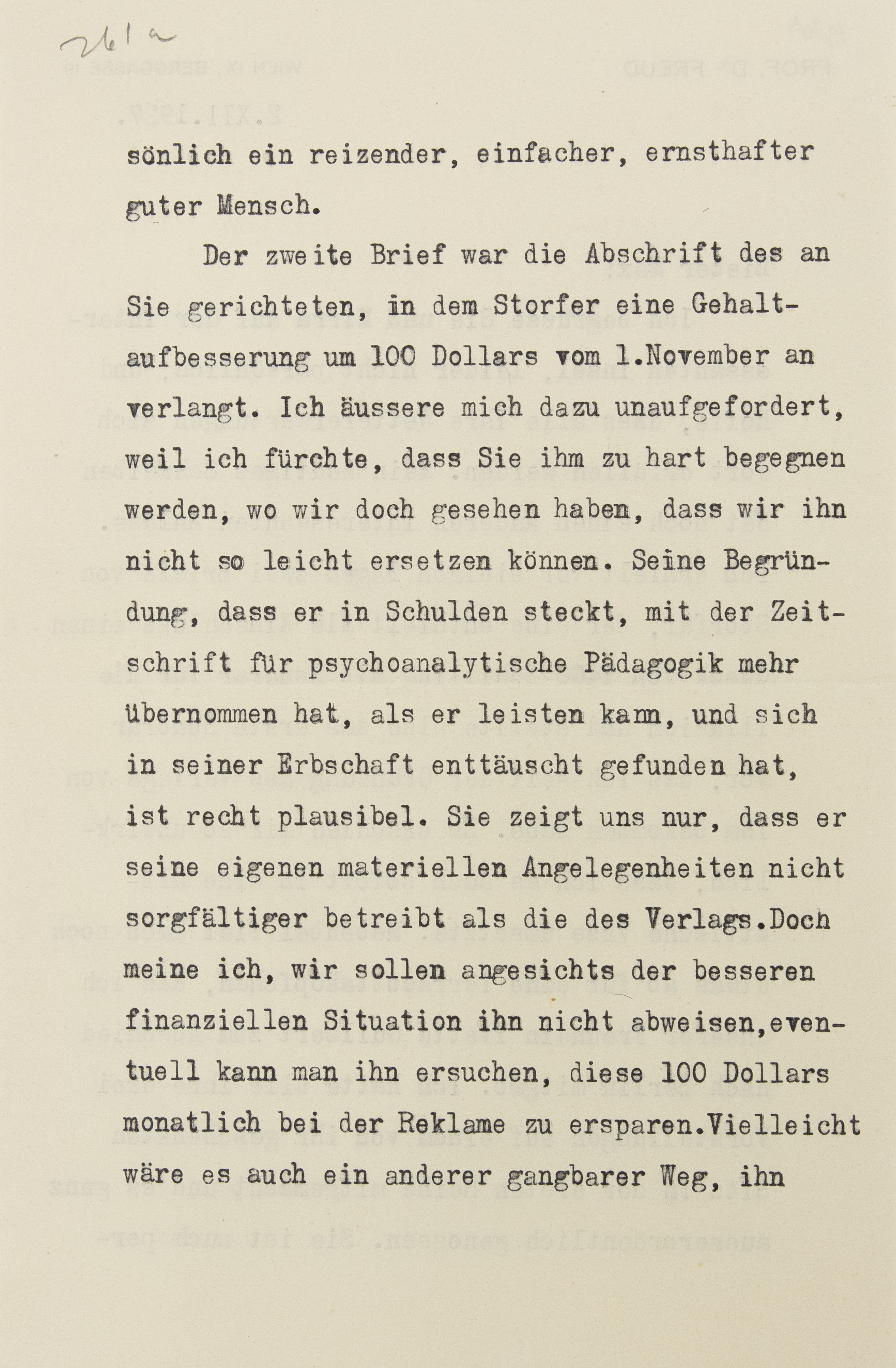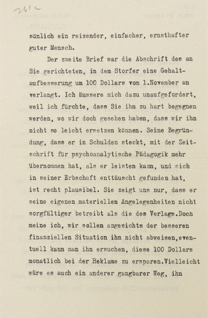 Der zweite Brief war die Abschrift des an Sie gerichteten, in dem Storfer eine Gehaltaufbesserung um 100 Dollars vom 1. November an verlangt. Ich äußere mich dazu unaufgefordert, weil ich fürchte, daß Sie ihm zu hart begegnen werden, wo wir doch gesehen haben, daß wir ihn nicht so leicht ersetzen können. Seine Begründung, daß er in Schulden steckt, mit der ‚Zeitschrift für psychoanalytische Pädagogik‘3 mehr übernommen hat, als er leisten kann, und sich in seiner Erbschaft enttäuscht gefunden hat, ist recht plausibel. Sie zeigt uns nur, daß er seine eigenen materiellen Angelegenheiten nicht sorgfältiger betreibt als die des Verlags. Doch meine ich, wir sollen angesichts der besseren finanziellen Situation ihn nicht abweisen, eventuell kann man ihn ersuchen, diese 100 Dollars monatlich bei der Reklame zu ersparen. Vielleicht wäre es auch ein anderer gangbarer Weg, ihmb anstatt der Gehaltsteigerung die Übernahme der pädagogischen Zeitschrift in unser Eigentum anzubieten. Ich glaube, das werden wir über kurz oder lang doch tun müssen. Das sind also meine Vorschläge, die Entscheidungen liegen ja bei Ihnen.