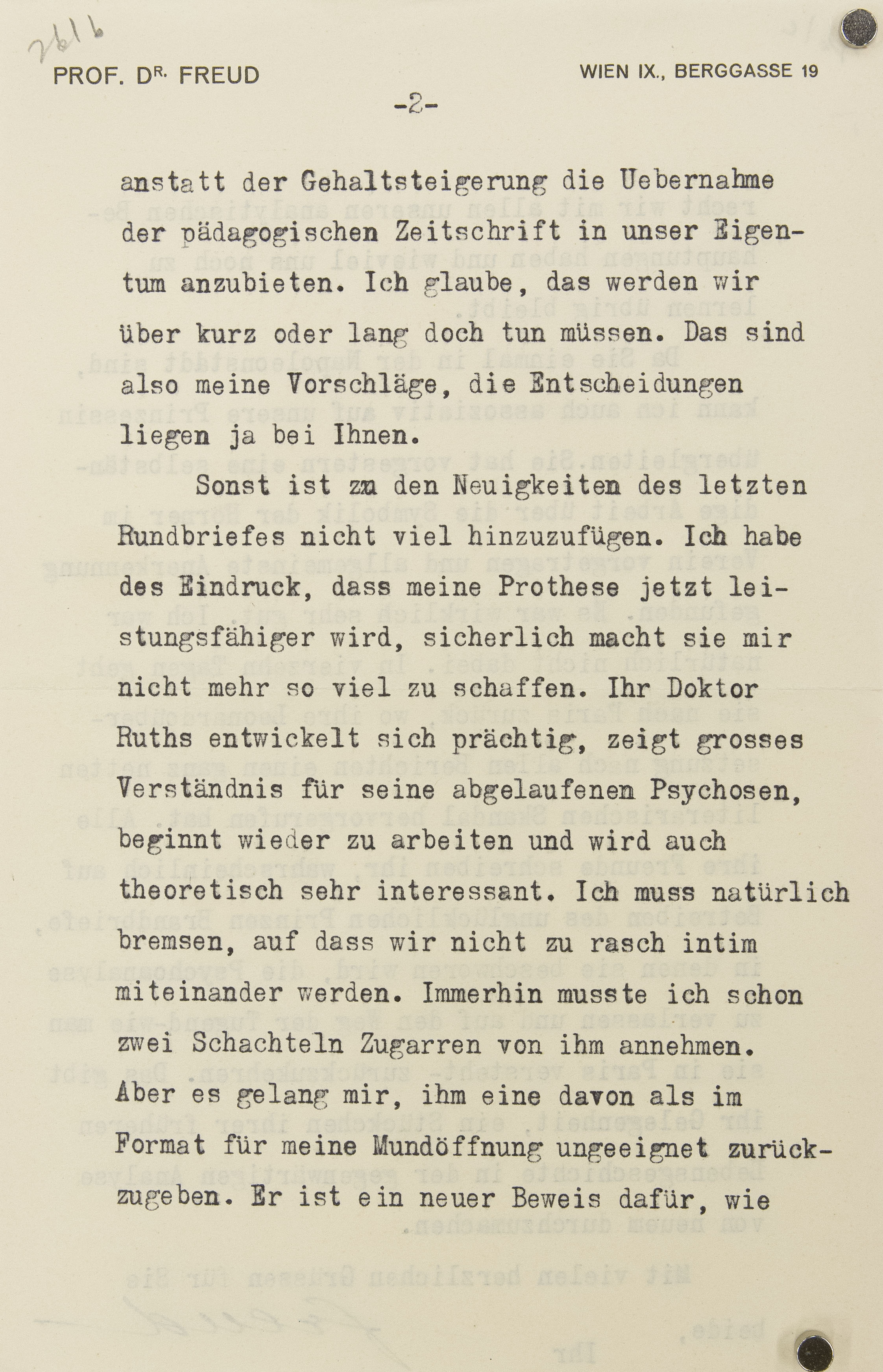 Sonst ist zu den Neuigkeiten des letzten Rundbriefes4 nicht viel hinzuzufügen. Ich habe den Eindruck, daß meine Prothese jetzt leistungsfähiger wird, sicherlich macht sie mir nicht mehr so viel zu schaffen. Ihr Doktor [U.] entwickelt sich prächtig, zeigt großes Verständnis für seine abgelaufenen Psychosen, beginnt wieder zu arbeiten und wird auch theoretisch sehr interessant. Ich muß natürlich bremsen, auf daß wir nicht zu rasch intim miteinander werden. Immerhin mußte ich schon zwei Schachteln Zigarren von ihm annehmen. Aber es gelang mir, ihm eine davon als im Format für meine Mundöffnung ungeeignet zurückzugeben. Er ist ein neuer Beweis dafür, wie recht wir mit allen unseren analytischen Behauptungen haben und wieviel uns noch zu lernen übrig bleibt.