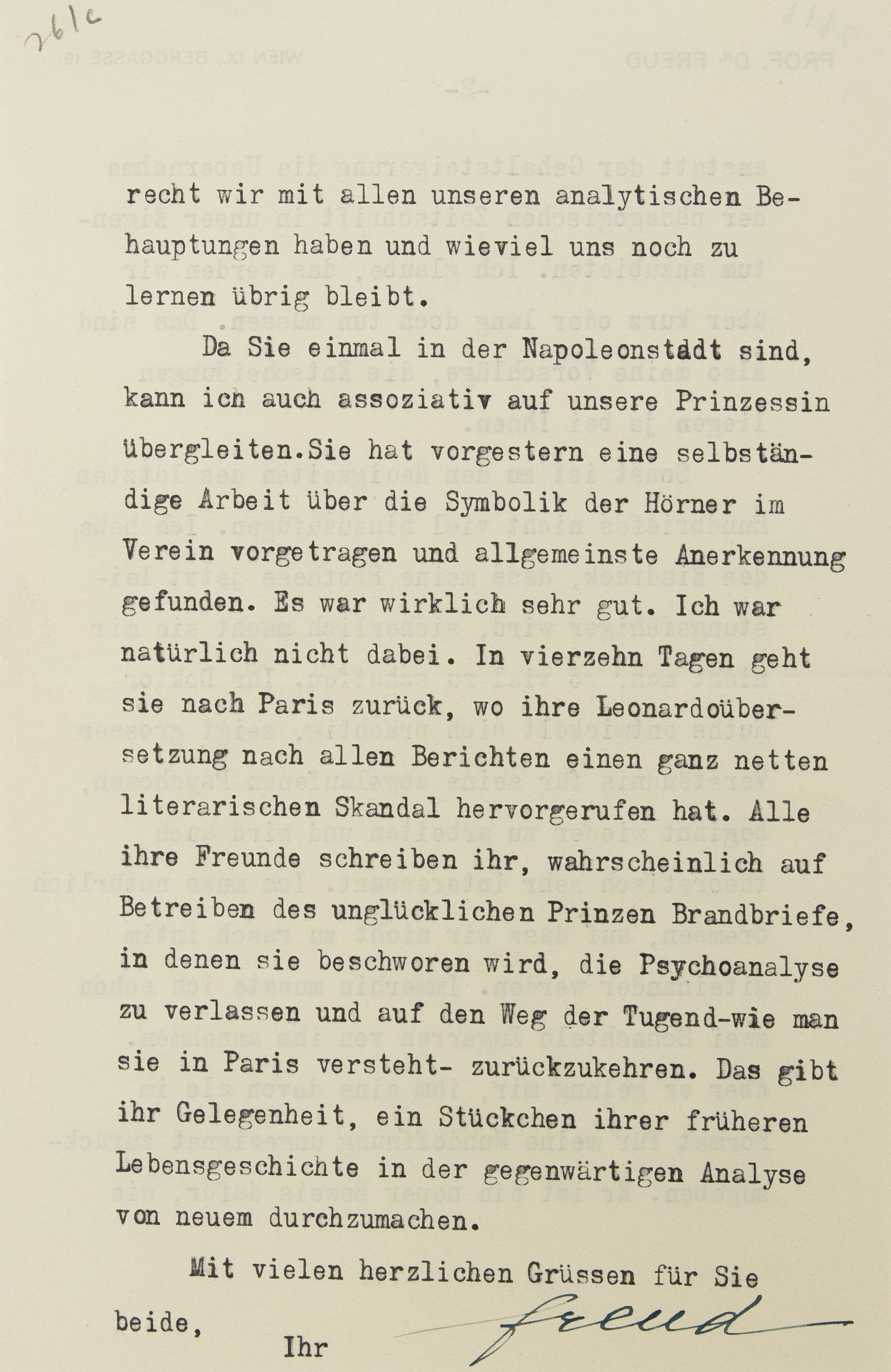 Da Sie einmal in der Napoleonstadt sind, kann ich auch assoziativ auf unsere Prinzessin übergleiten. Sie hat vorgestern eine selbständige Arbeit über die Symbolik der Hörner5 im Verein vorgetragen und allgemeinste Anerkennung gefunden. Es war wirklich sehr gut. Ich war natürlich nicht dabei. In vierzehn Tagen geht sie nach Paris zurück, wo ihre Leonardoübersetzung nach allen Berichten einen ganz netten literarischen Skandal hervorgerufen hat. Alle ihre Freunde schreiben ihr, wahrscheinlich auf Betreiben des unglücklichen Prinzen,6 Brandbriefe, in denen sie beschworen wird, die Psychoanalyse zu verlassen und auf den Weg der Tugend – wie man sie in Paris versteht – zurückzukehren. Das gibt ihr Gelegenheit, ein Stückchen ihrer früheren Lebensgeschichte in der gegenwärtigen Analyse von neuem durchzumachen.