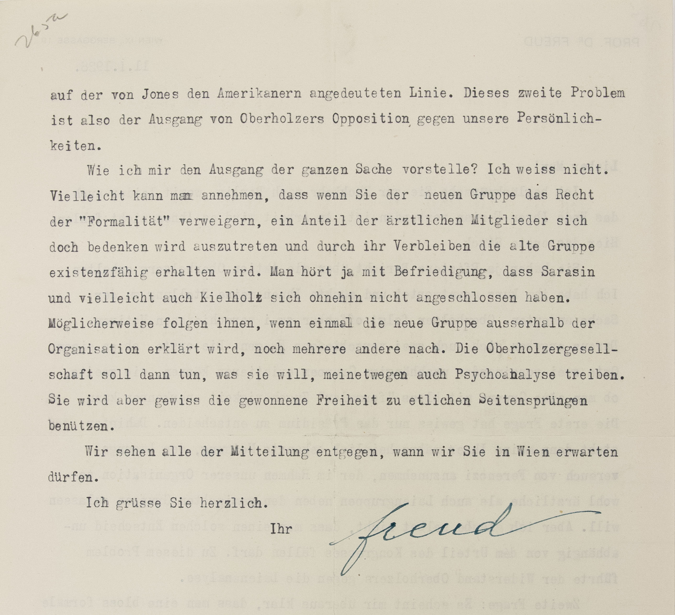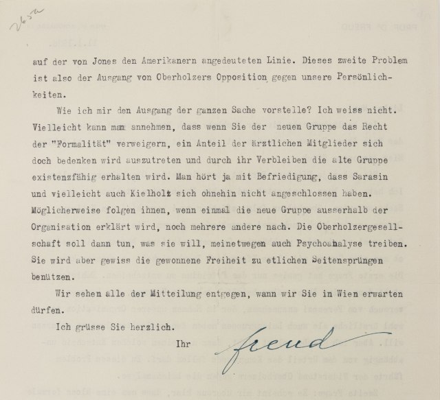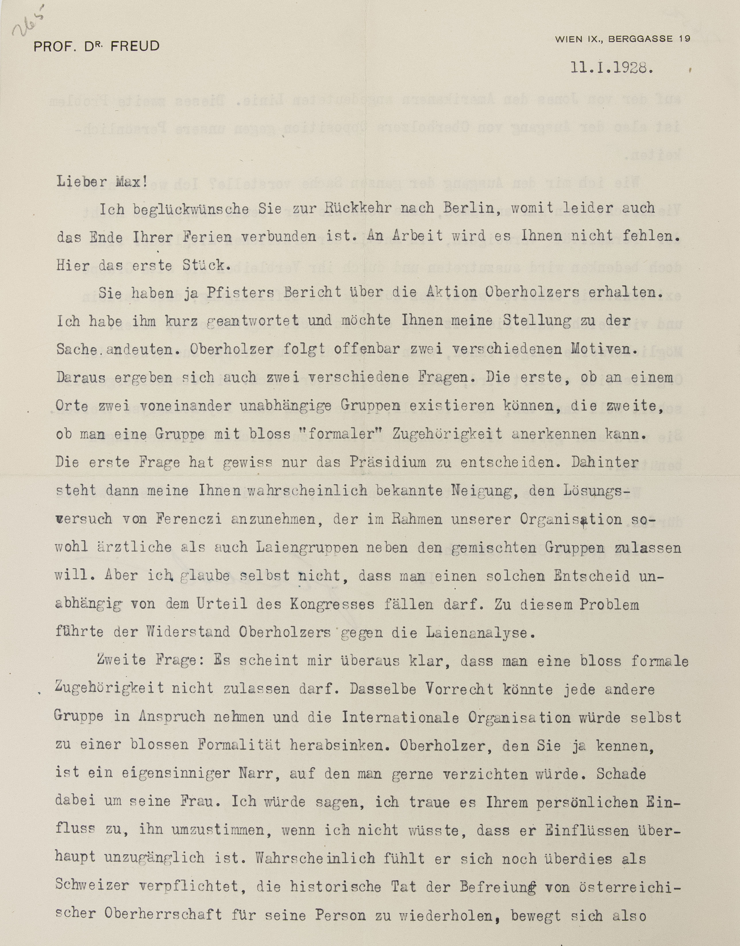 Sie haben ja Pfisters Bericht über die Aktion Oberholzers1 erhalten. Ich habe ihm kurz geantwortet2 und möchte Ihnen meine Stellung zu der Sache andeuten. Oberholzer folgt offenbar zwei verschiedenen Motiven. Daraus ergeben sich auch zwei verschiedene Fragen. Die erste, ob an einem Orte zwei voneinander unabhängige Gruppen existieren können, die zweite, ob man eine Gruppe mit bloß „formaler“ Zugehörigkeit anerkennen kann. Die erste Frage hat gewiß nur das Präsidium zu entscheiden. Dahinter steht dann meine Ihnen wahrscheinlich bekannte Neigung, den Lösungsversuch von Ferenczi anzunehmen, der im Rahmen unserer Organisation sowohl ärztliche als auch Laiengruppen neben den gemischten Gruppen zulassen will.3 Aber ich glaube selbst nicht, daß man einen solchen Entscheid unabhängig von dem Urteil des Kongresses fällen darf. Zu diesem Problem führte der Widerstand Oberholzers gegen die Laienanalyse.