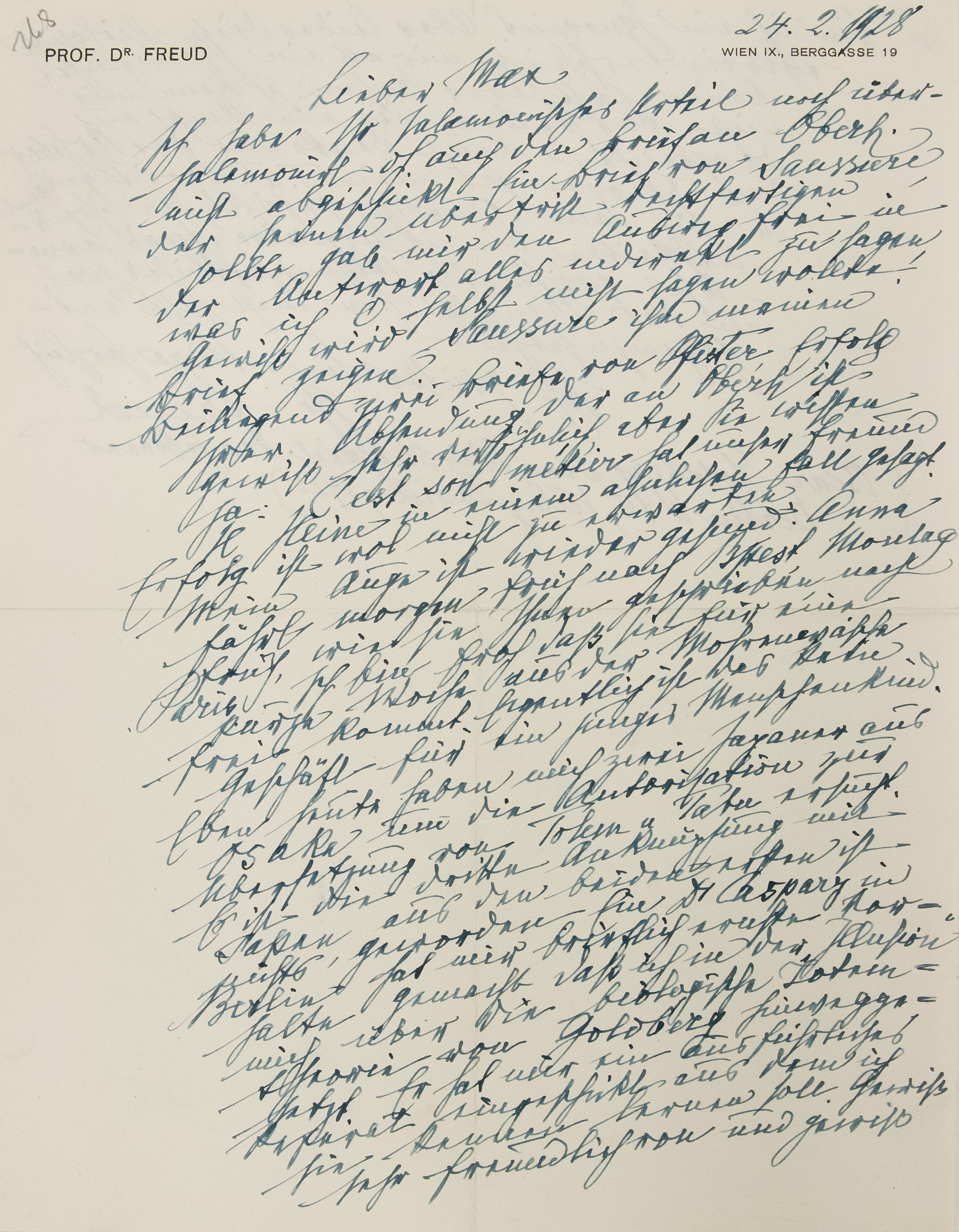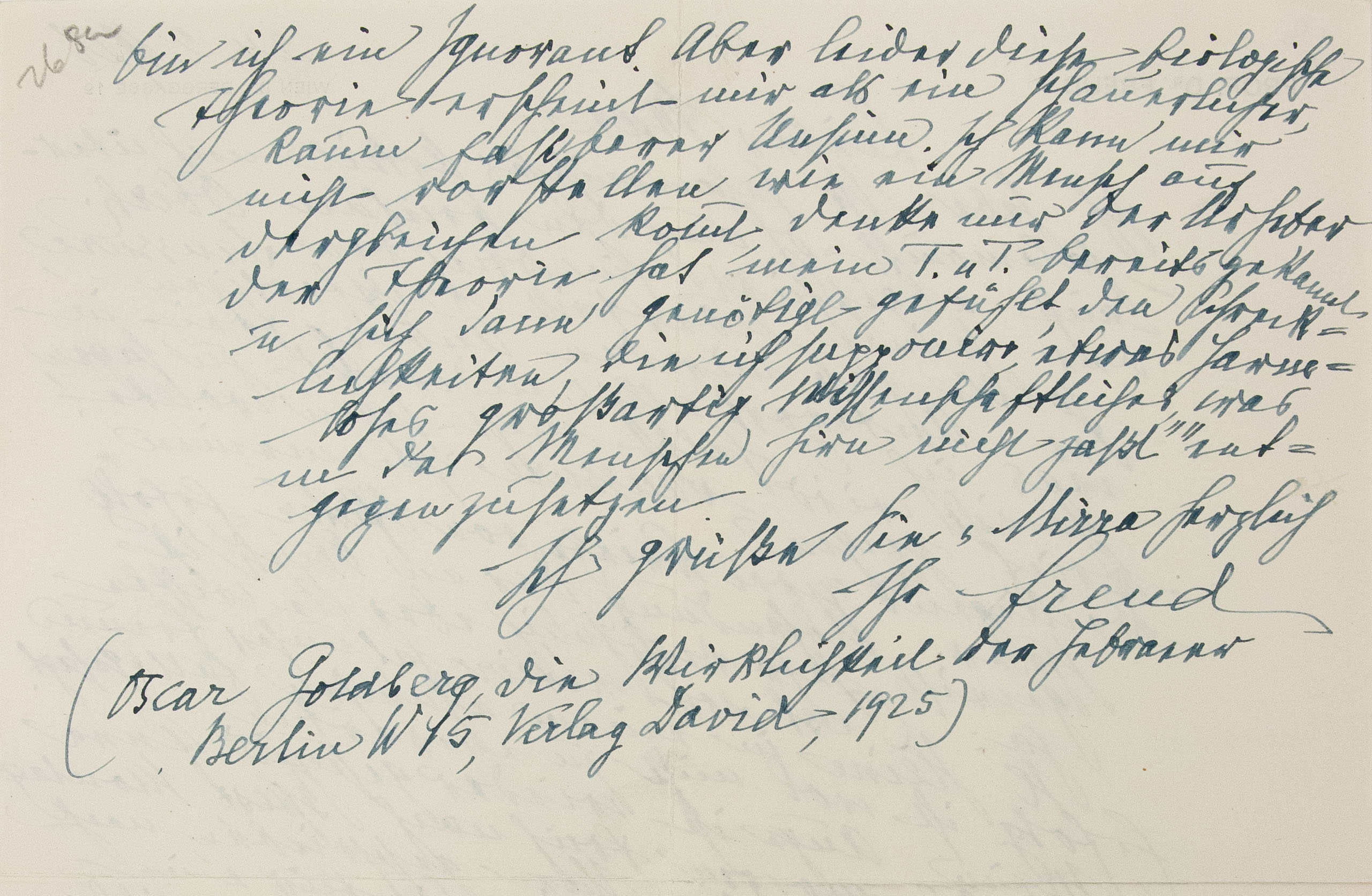Eben heute haben mich zwei Japaner aus Osaka um die Autorisation zur Übersetzung von ‚Totem und Tabu‘ ersucht. Es ist die dritte Anknüpfung mit Japan, aus den beiden ersten ist nichts geworden. Ein Dr. Caspary in Berlin hat mir brieflich ernste Vorhalte gemacht, daß ich in der ‚Illusion‘ mich über die biologische Totemtheorie von Goldberg7 hinweggesetzt. Er hat mir ein ausführliches Referat eingeschickt, aus dem ich sie kennen lernen soll. Gewiß sehr freundlich von [ihm], und gewiß bin ich ein Ignorant. Aber leider, diese biologische Theorie erscheint mir als ein schauerlicher, kaum faßbarer Unsinn. Ich kann mir nicht vorstellen, wie ein Mensch auf dergleichen kommt, denke mira, der Urheber der Theorie hat mein ‚Totem und Tabu‘ bereits gekannt und sich dann genötigt gefühlt, den Schrecklichkeiten, die ich supponiere, etwas Harmloses, großartig Wissenschaftliches, „was in des Menschen Hirn nicht paßt“,8 entgegen zu setzen.