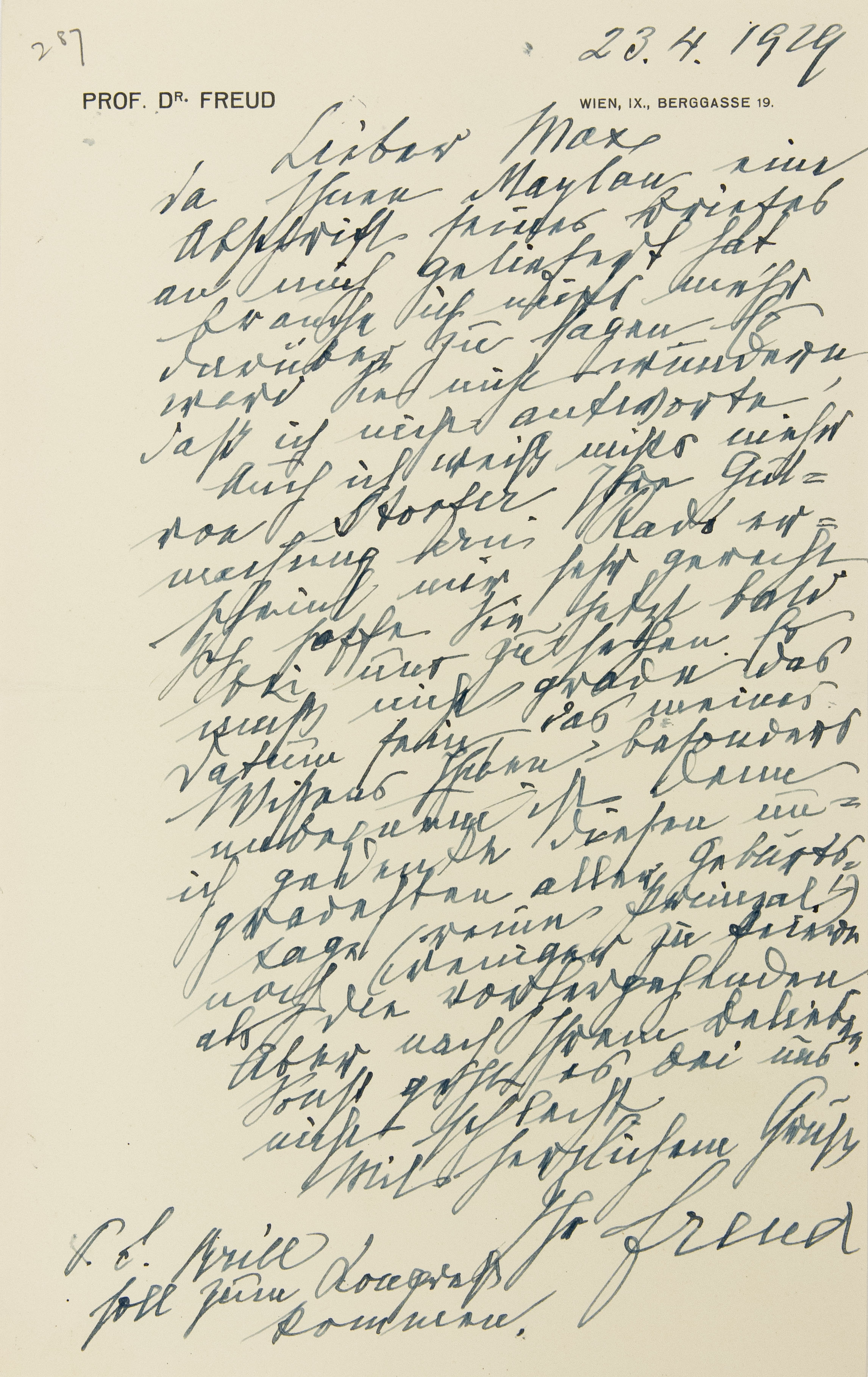 Auch ich weiß nichts mehr von Storfer. Ihre Gutmachung an Radó erscheint mir sehr gerecht. Ich hoffe Sie jetzt bald bei uns zu sehen. Es muß nicht grade das Datum sein, das meines Wissens Ihnen besonders unbequem ist.1 Denn ich gedenke diesen ungradesten aller Geburtstage (reine Primzahl!) noch weniger zu feiern als die vorhergehenden. Aber nach Ihrem Belieben.