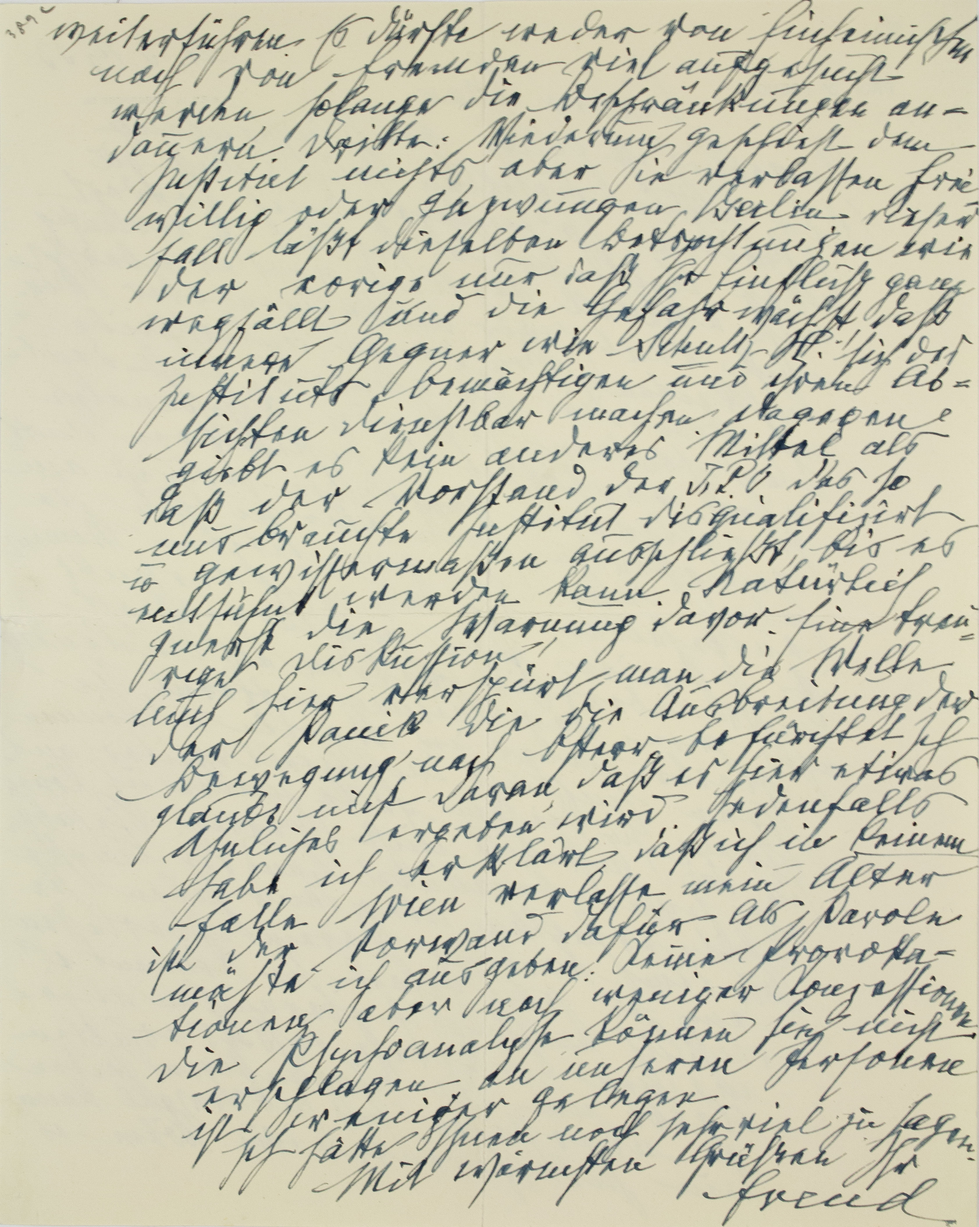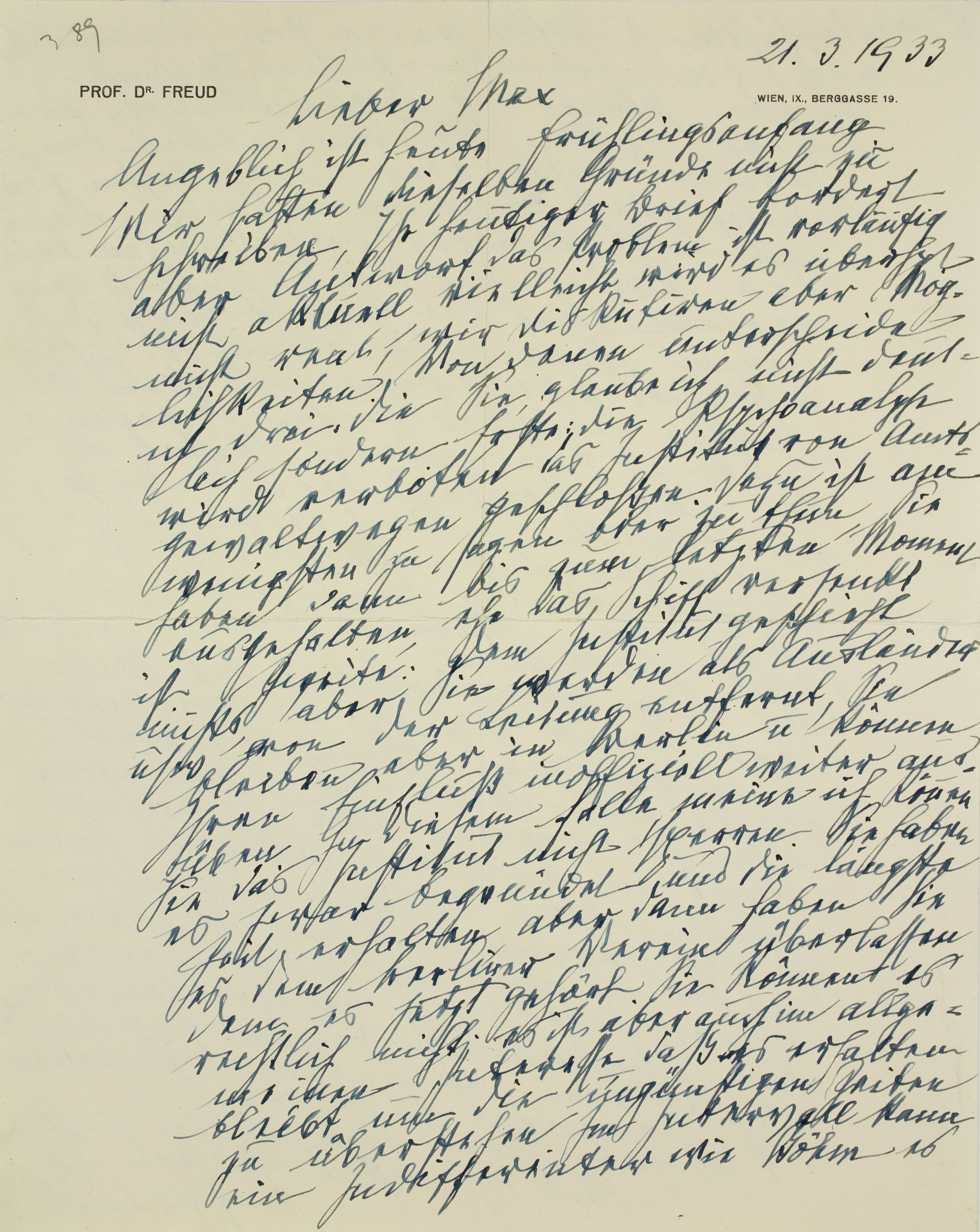 Angeblich ist heute Frühlingsanfang. Wir hatten dieselben Gründe, nicht zu schreiben, Ihr heutiger Brief fordert aber Antwort. Das Problem ist vorläufig nicht aktuell, vielleicht wird es überhaupt nicht real, wir diskutieren aber Möglichkeiten. Von denen unterscheide ich drei, die Sie, glaube ich, nicht deutlich sondern. Erste: Die Psychoanalyse wird verboten, das Institut von Amtsgewalt wegen geschlossen. Dazu ist am wenigsten zu sagen oder zu tun, Sie haben dann bis zum letzten Moment ausgehalten, ehe das Schiff versenkt ist.1 Zweite: Dem Institut geschieht nichts, aber Sie werden als Ausländer usw. von der Leitung entfernt, Sie bleiben aber in Berlin und können Ihren Einfluß inoffiziell weiter ausüben. In diesem Falle, meine ich, können Sie das Institut nicht sperren. Sie haben es zwar begründet und die längste Zeit erhalten, aber dann haben Sie es dem Berliner Verein überlassen, dem es jetzt gehört.2 Sie können es rechtlich nicht; es ist aber auch im allgemeinen Interesse, daß es erhalten bleibt, um die ungünstigen Zeiten zu überstehen. Im Intervall kann ein Indifferenter3 wie Boehm es weiterführen. Es dürfte weder von Einheimischen noch von Fremden viel aufgesucht werden, solange die Beschränkungen andauern. Dritte: Wiederum geschieht dem Institut nichts, aber Sie verlassen freiwillig oder gezwungen Berlin. Dieser Fall läßt dieselben Betrachtungen wie der vorige [zu], nur daß Ihr Einfluß ganz wegfällt und die Gefahr wächst, daß innere Gegner wie Schultz-H[encke] sich des Instituts bemächtigen und [es] ihren Absichten dienstbar machen. Dagegen gibt es kein anderes Mittel, als daß der Vorstand der I.P.V. das so mißbrauchte Institut disqualifiziert und gewissermaßen ausschließt, bis es entsühnt werden kann. Natürlich zuerst die Warnung davor. Eine traurige Diskussion!