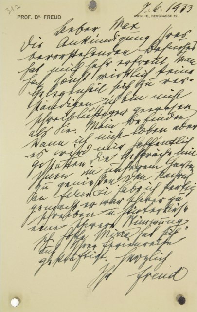 Die Ankündigung Ihres bevorstehenden Besuches hat mich sehr erfreut. Man hat sonst wirklich keine Gelegenheit, sich zu verständigen; ich bin nicht schreiblustiger gewesen als Sie. Mein Befinden kann ich nicht loben, aber es wird mir hoffentlich gestatten, die Gespräche mit Ihnen in unserem Garten1 zu genießen. Den Nachruf an Ferenczi2 habe ich fertig gemacht, er war schwer zu schreiben und hinterließ eine schwere Stimmung.