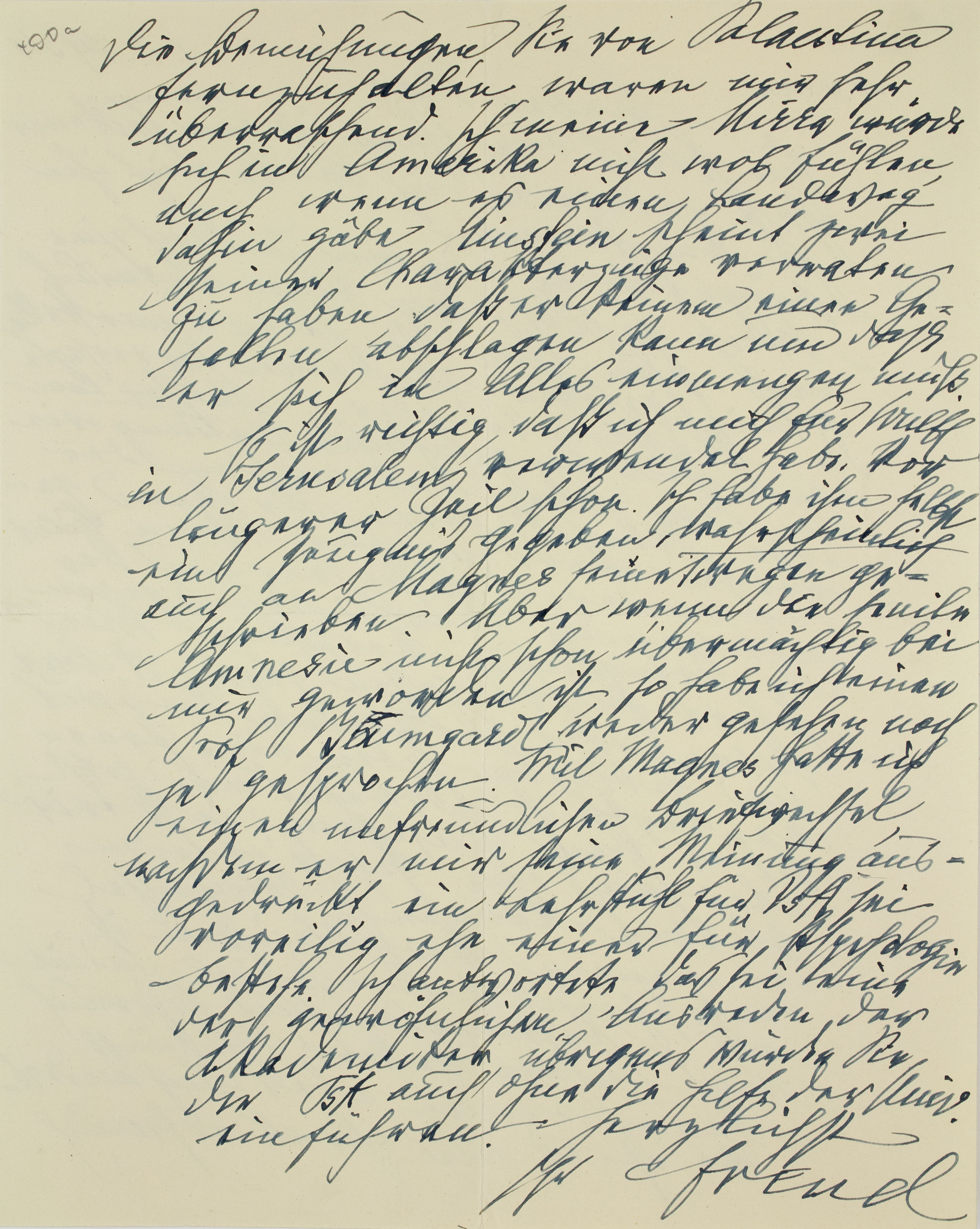 Die Bemühungen, Sie von Palästina fernzuhalten, waren mir sehr überraschend.3 Ich meine, Mirra würde sich in Amerika nicht wohl fühlen, auch wenn es einen Landweg dahin gäbe.4 Einstein scheint zwei seiner Charakterzüge verraten zu haben, daß er keinem einen Gefallen abschlagen kann und daß er sich in alles einmengen muß.