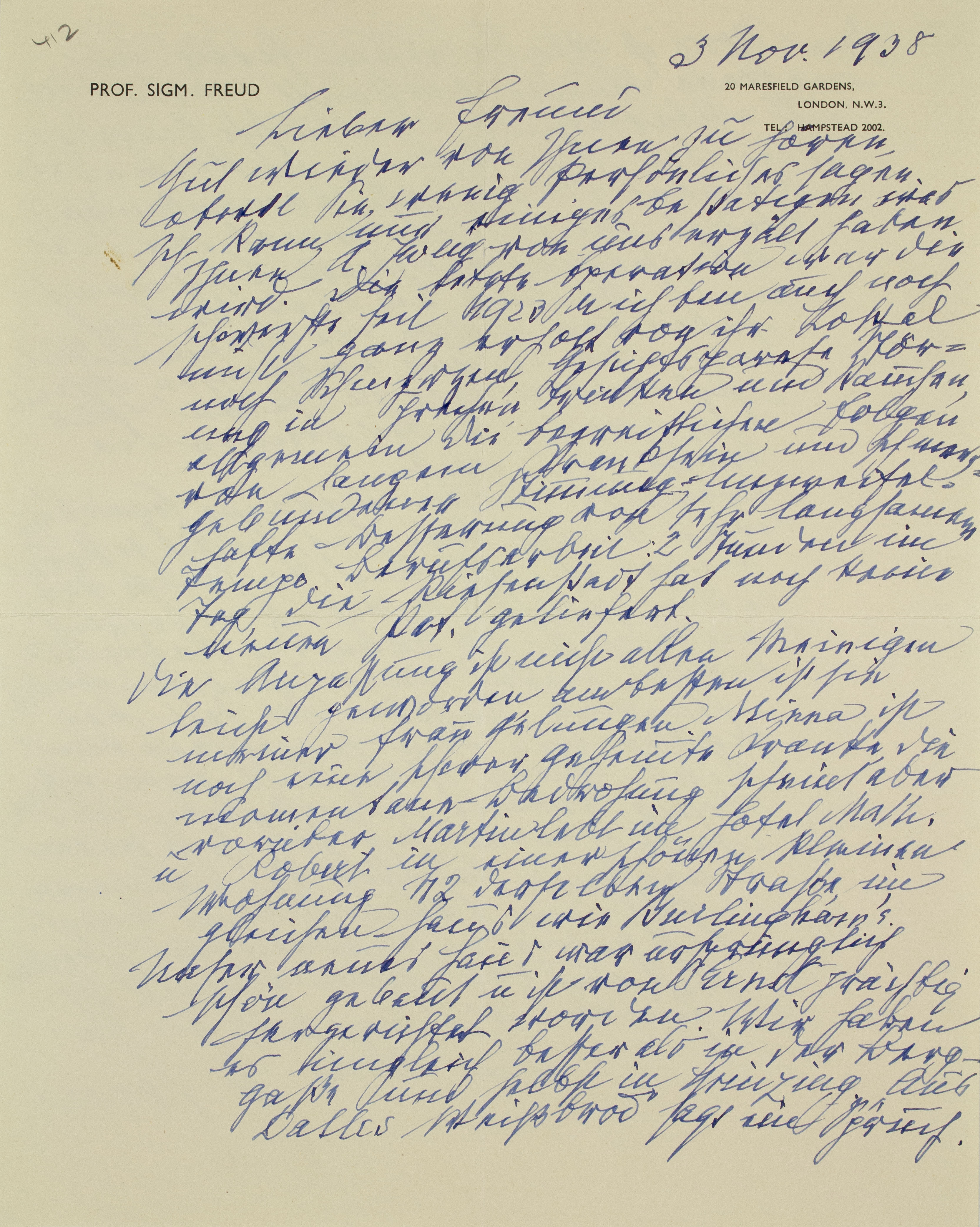a Gedruckter Briefkopf: Prof. Sigm. Freud, 20 Maresfield Gardens, London, N.W. 3, Tel.: Hampstead 2002. Benutzt bis 1939.
