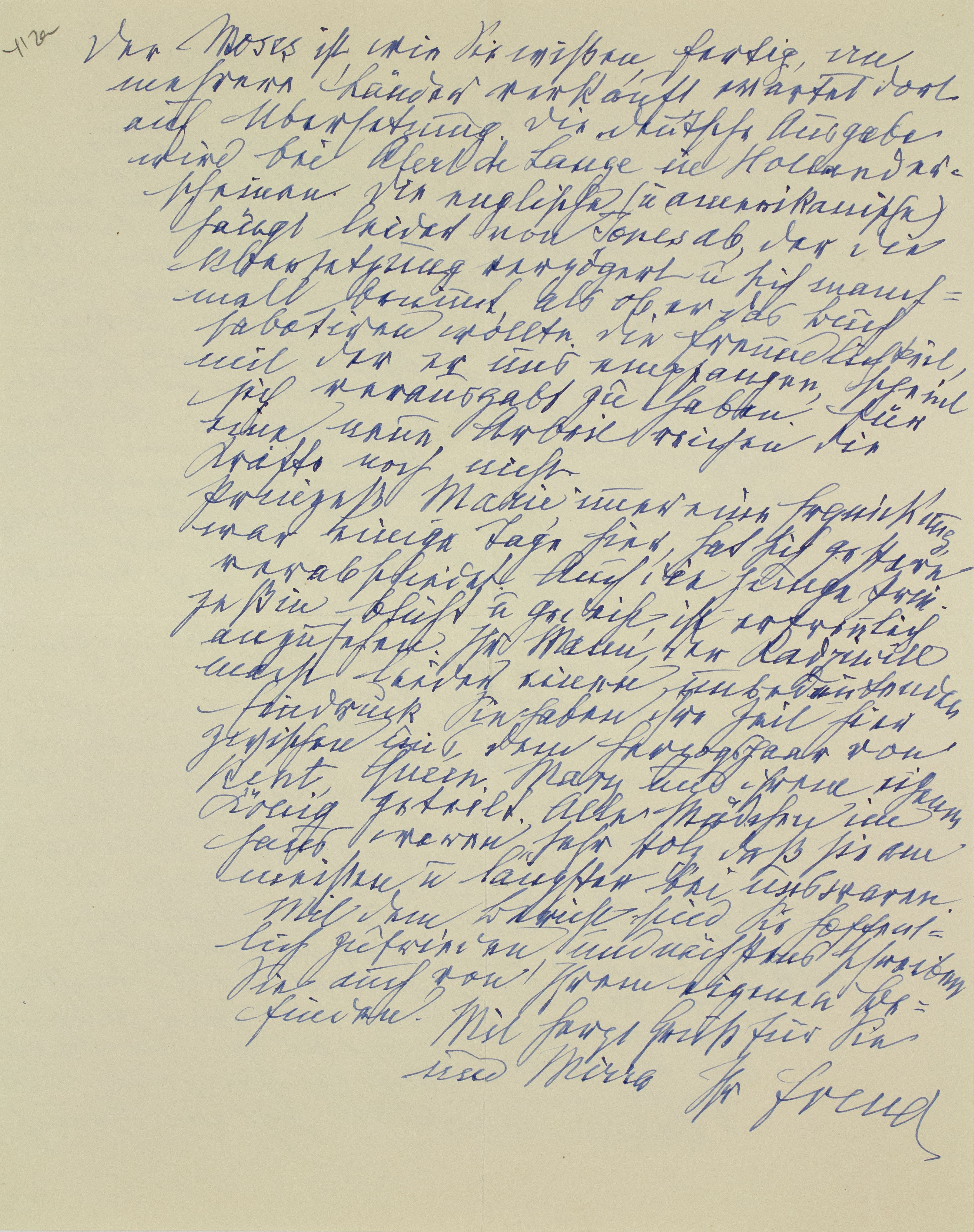 Der ‚Moses‘ ist, wie Sie wissen, fertig,4 an mehrere Länder verkauft, wartet dort auf Übersetzung. Die deutsche Ausgabe wird bei Allertc de Lange in Holland erscheinen. Die englische (und amerikanische) hängt leider von Jones ab, der die Übersetzung verzögert und sich manchmal benimmt, als ob er das Buch sabotieren wollte.5 Die Freundlichkeit, mit der er uns empfangen, scheint sich verausgabt zu haben. Für eine neue Arbeit reichen die Kräfte noch nicht.