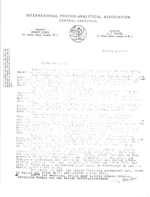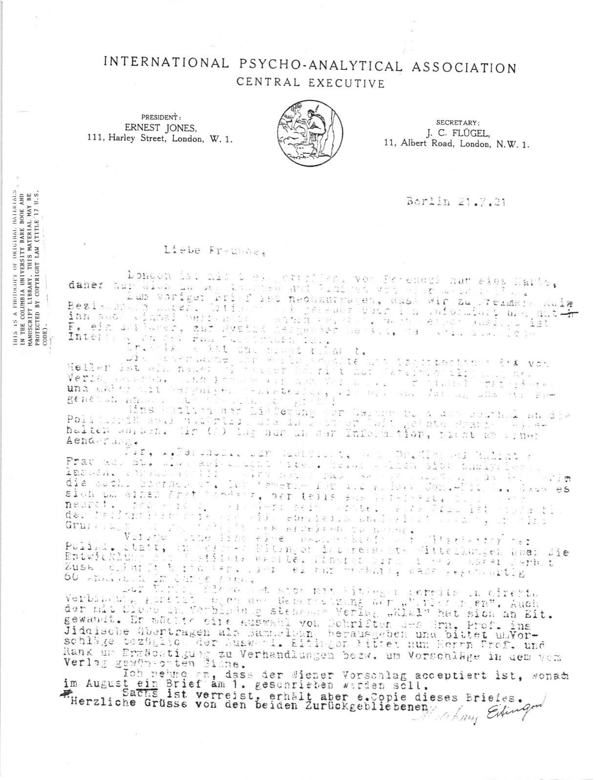 schläge bezüglich der Auswahl. Eitingon bittet nun Herrn Professor und