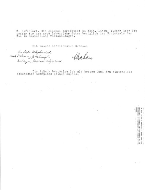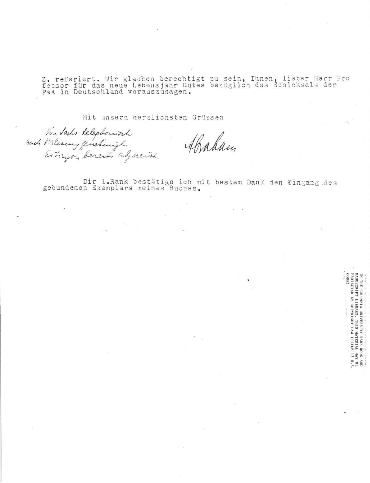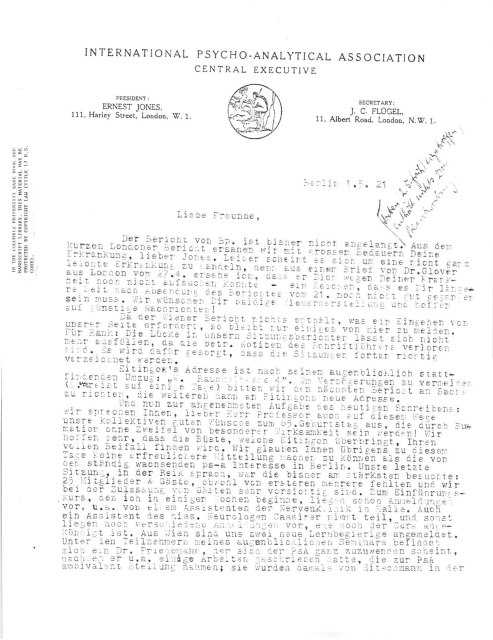 Eitingon bereits abgezeichnet.Dir l. Rank bestätige ich mit bestem Dank den Eingang des