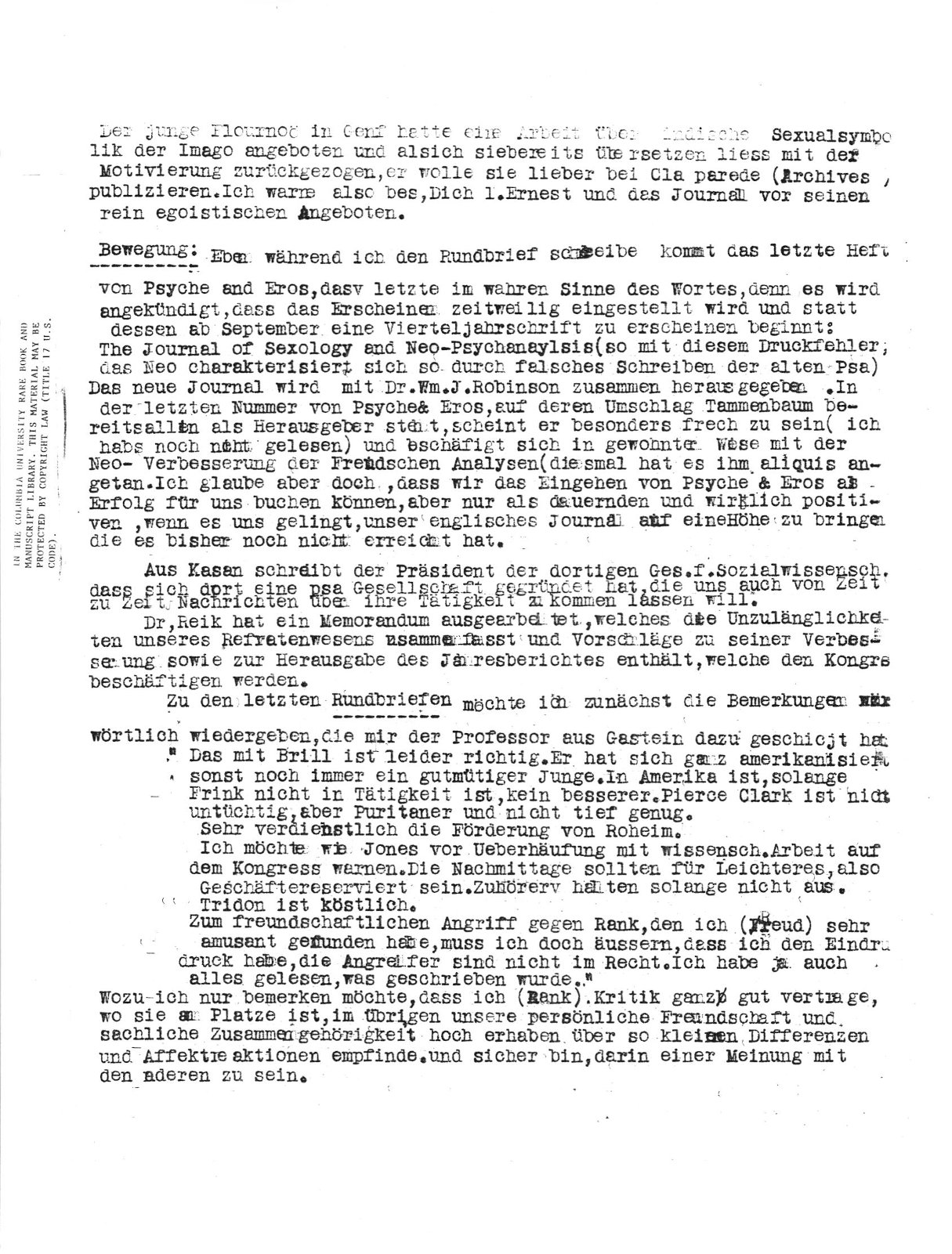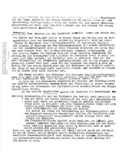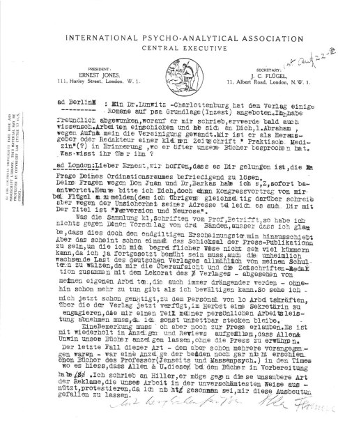 von Zeit zu Zeit Nachrichten über ihre Tätigkeit zukommen lassen will.Dr. Reik hat ein Memorandum ausgearbeitet, welches die Unzulänglichkei-