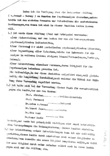 Indem ich die Verfügung über die Budapester Stiftung (v. Freund2 – Barczy3) zu Gunsten der Psychoanalyse übernehme, unterbreite ich den nächsten Freunden und Mitarbeitern die nachstehenden Bestimmungen, von denen ich mich in dieser Funktion leiten lassen will.