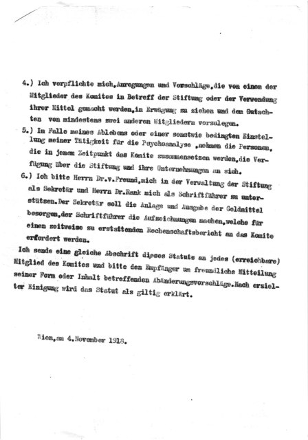 - Im Falle meines Ablebens oder einer sonstwie bedingten Einstel- lung meiner Tätigkeit für die Psychoanalyse, nehmen die Personen, die in jenem Zeitpunkt das Komitee zusammensetzen werden, die Verfügung über die Stiftung und ihre Unternehmungen an sich.