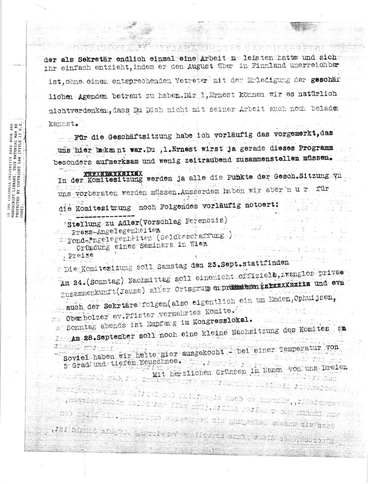 die Komitésitzung noch Folgendes vorläufig notiert:Stellung zu Adler (Vorschlag Ferenczi)