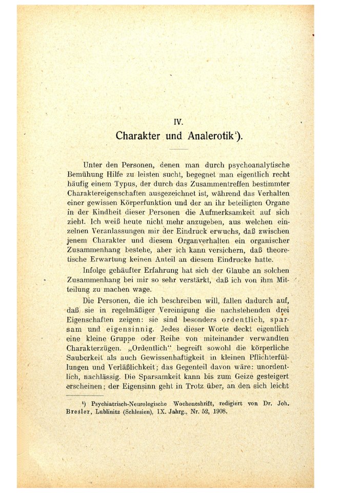 Freud, Sigmund 1908-002/1931 10422 Charakter und Analerotik Kl. 8° [4] 62–68 Fertig Fertig Ganz fertig / zutreffend Fehlt Fehlt Ganz fertig / zutreffend EB