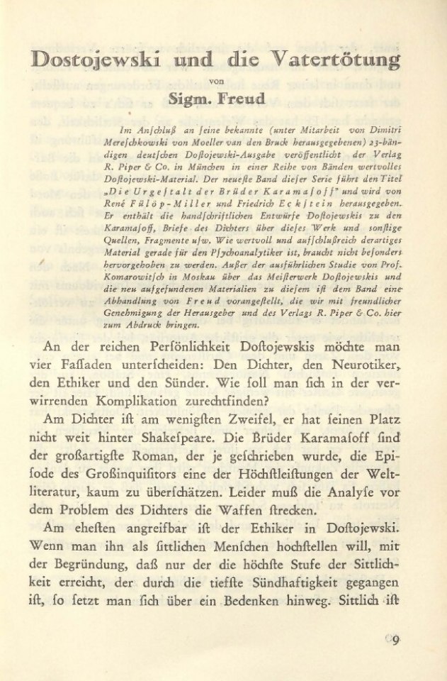 Freud, Sigmund | 1928-002/1969 | 1928b [1927] | Dostojewski und die Vatertötung | SA 10 | 267–286 | Fertig ✔ | Nicht erforderlich/ | Nicht erforderlich/ | Nicht erforderlich/ | Nicht erforderlich/ | Nicht erforderlich/ | ✔ | ✔ | ||||
