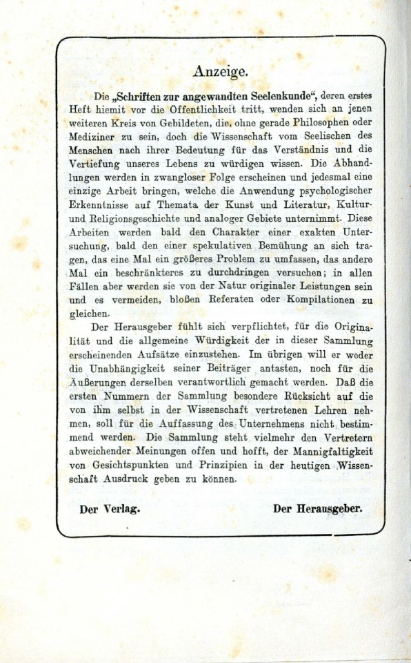 | Freud, Sigmund | Bunker, H. A. | 1907-051/1959.en | Prospectus for Schriften zur angewandten Seelenkunde | SE 9, 1959 | 248–249 | Fertig ✔ | Nicht erforderlich/ | Nicht erforderlich/ | Nicht erforderlich/ | Nicht erforderlich/ | Nicht erforderlich/ | ✔ | ✔ | ||||