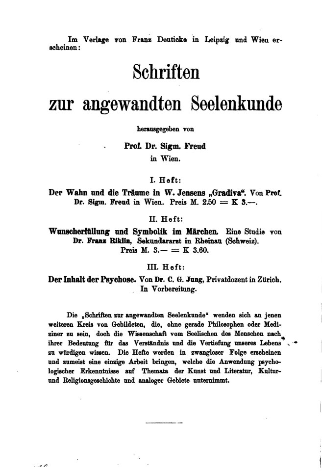 | Freud, Sigmund | 1907-051/1908 | 1908g | 1908-07 | Schriften zur angewandten Seelenkunde [Anzeige] | Freud, Sigmund: Der Wahn und die Träume in W. Jensens „Gradiva“. (2. Deuticke-Quote). Leipzig, Wien: Franz Deuticke 1908 | ii | Teilweise - | Fertig ✔ | Ganz fertig / zutreffend ✔ | Fertig ✔ | Fehlt ✖ | Ganz fertig / zutreffend ✔ | ✔ | EB | ✔ | ||