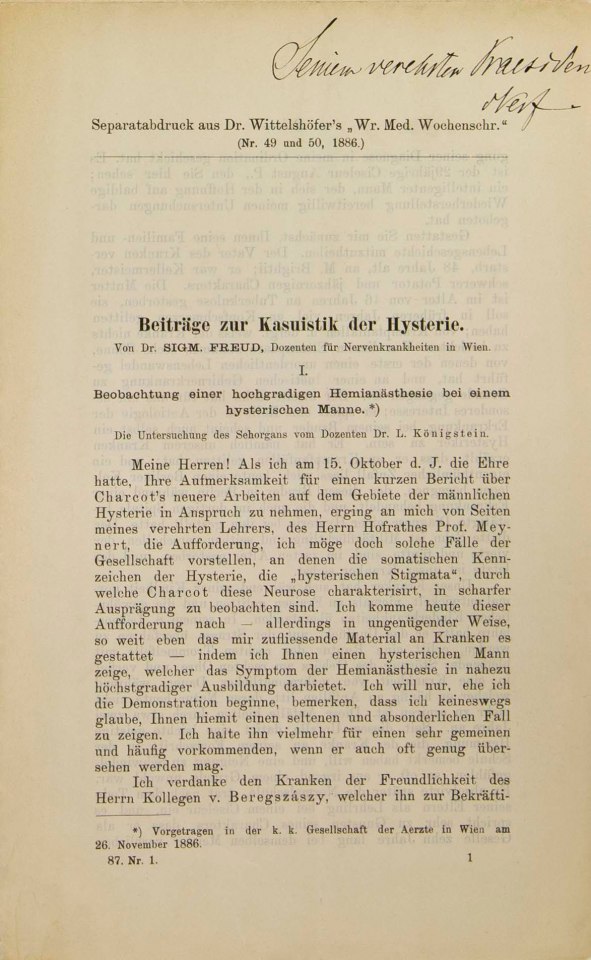 Freud, Sigmund | 1886-004/2015 | 1886-04 | Beobachtungen einer hochgradigen Hemianästhesie bei einem hysterischen Manne | SFG 2 | 63, 65–76 | Fertig ✔ | Nicht erforderlich/ | Nicht erforderlich/ | Nicht erforderlich/ | Nicht erforderlich/ | Nicht erforderlich/ | ✔ | ✔ |