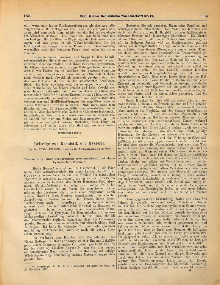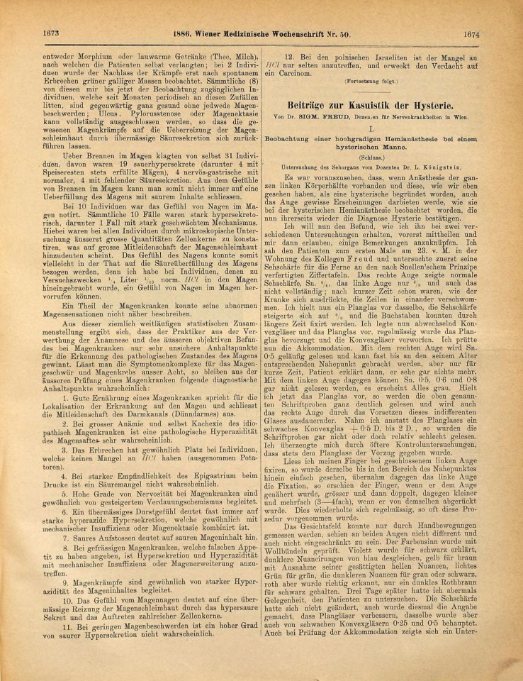 Freud, Sigmund | 1886-004/1886.3 | Beobachtungen einer hochgradigen Hemianästhesie bei einem hysterischen Manne | Wiener Medizinische Wochenschrift, 36, 1886, 49-50 | 1–13 | Fertig ✔ | Fertig ✔ | Ganz fertig / zutreffend ✔ | Fehlt ✖ | Fehlt ✖ | Ganz fertig / zutreffend ✔ | ✖ | EB | ✔ | ||||