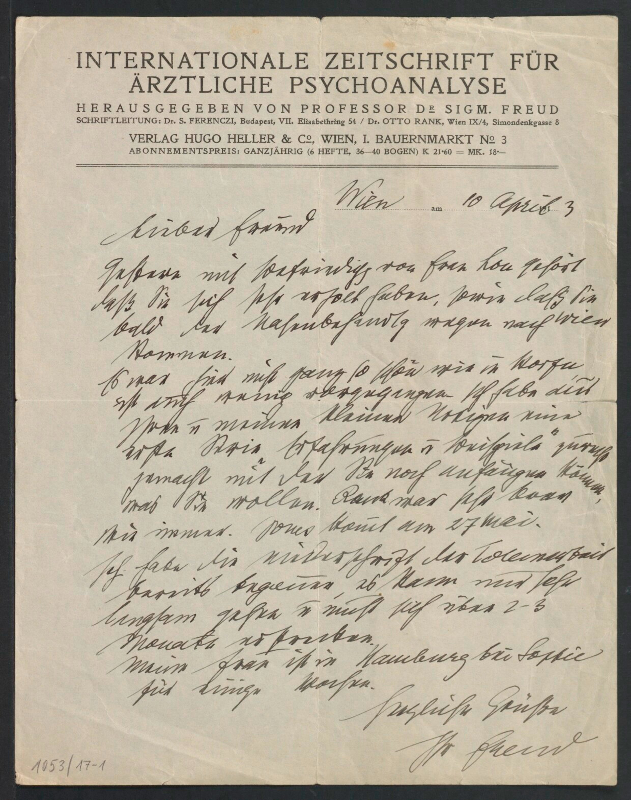 Gestern mit Befriedigung von Frau Lou gehört1, daß Sie sich sehr erholt haben sowie daß Sie bald der Nasenbehandlung wegen nach Wien kommen.