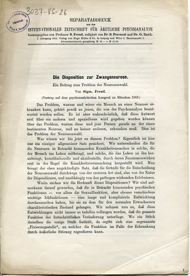 Freud, Sigmund 1913-010/1931 10428 Die Disposition zur Zwangsneurose Kl. 8° [3] 5–16 Fertig Fertig Ganz fertig / zutreffend Fehlt Fehlt Teilweise - EB