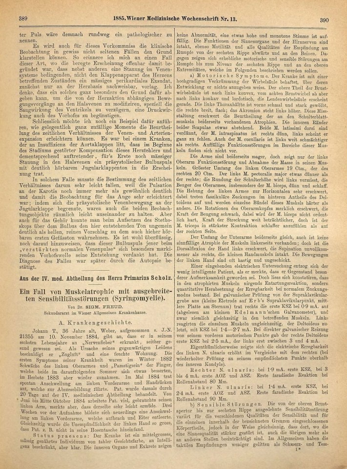Freud, Sigmund | 1885-002/1885 | 1885c | 1885-05 | 10368 | Ein Fall von Muskelatrophie mit ausgebreiteten Sensibilitätsstörungen (Syringomyelie) | Wiener medizinische Wochenschrift, 35, 1885, 13 | 389–392 | Fertig ✔ | Fertig ✔ | Ganz fertig / zutreffend ✔ | Fehlt ✖ | Fehlt ✖ | Ganz fertig / zutreffend ✔ | ✔ | EB | ✔ | |