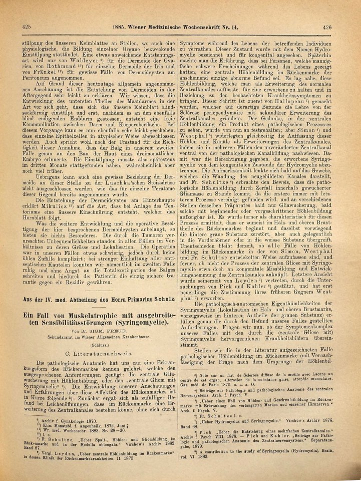 Freud, Sigmund | 1885-002/1885.2 | 1885c | 1885-05 | 10368 | Ein Fall von Muskelatrophie mit ausgebreiteten Sensibilitätsstörungen (Syringomyelie). (Schluss) | Wiener Medizinische Wochenschrift, 35, 1885, 14 | 425–429 | Fertig ✔ | Fertig ✔ | Ganz fertig / zutreffend ✔ | Fehlt ✖ | Fehlt ✖ | Ganz fertig / zutreffend ✔ | ✔ | EB | ✔ | |
