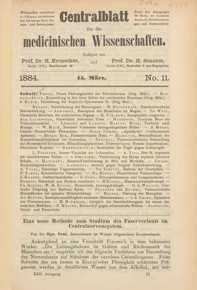 Freud, Sigmund | 1884-002/1884.3 | 1884b | 1884-02 | 10379 | Eine neue Methode zum Studium des Faserverlaufs im Centralnervensystem | Centralblatt für die medicinischen Wissenschaften, 22, 1884, 11 | 161–163 | Fertig ✔ | Fertig ✔ | Ganz fertig / zutreffend ✔ | Fehlt ✖ | Fehlt ✖ | Ganz fertig / zutreffend ✔ | ✔ | EB | ✔ | |