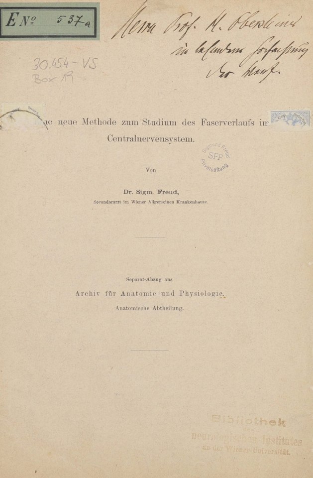 Freud, Sigmund | 1884-002/1884.2 | Eine neue Methode zum Studium des Faserverlaufs im Centralnervensystem | Separatum Archiv für Anatomie und Physiologie. Anatomische Abtheilung, 1884, [9. Band], | 453–460 | Fertig ✔ | Teilweise - | Teilweise - | Fehlt ✖ | Fehlt ✖ | Ganz fertig / zutreffend ✔ | ✔ | EB | ✔ | ||||
