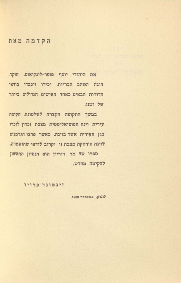 | Freud, Sigmund | 1939-063/1939 | 1939-40a [1938] | 1939-07 | [279] | [Einführung] | Doryon, Israel: Lynkeus’ New State. A plan for the establishment of a new social order on an improved and humane basis. Jerusalem: Rubin Mass 1939 | 6–7 | Fertig ✔ | Fertig ✔ | Ganz fertig / zutreffend ✔ | Fehlt ✖ | Fehlt ✖ | Ganz fertig / zutreffend ✔ | ✔ | EB | ✔ | |