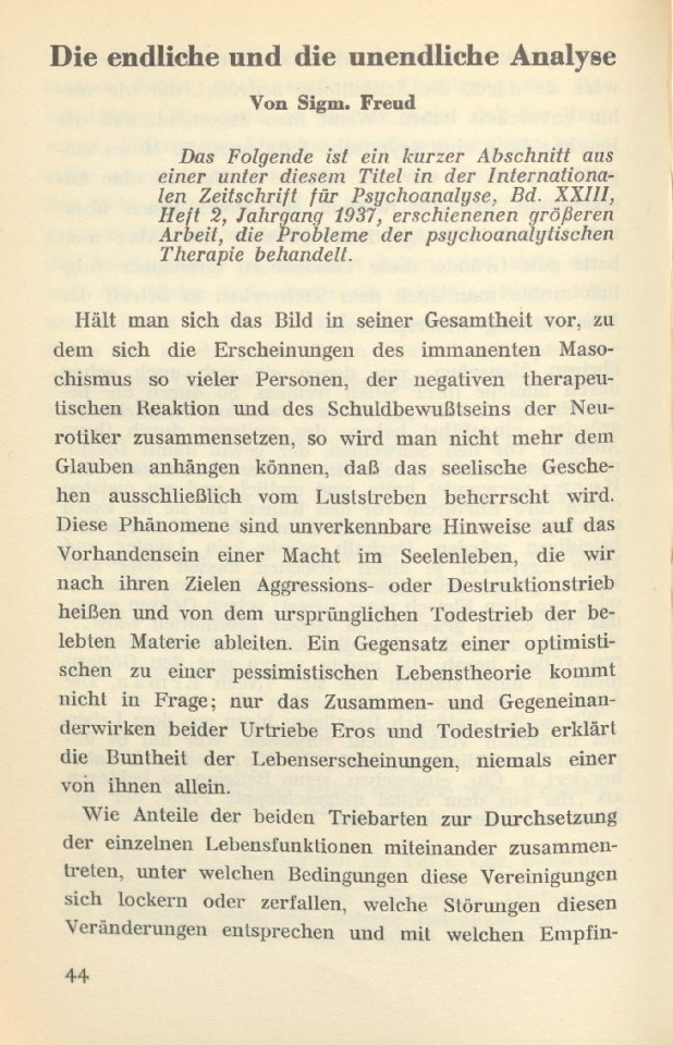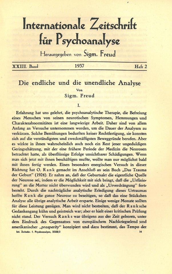 Freud, Sigmund | 1937-001/1950 | 1937c | 10440 | Die endliche und die unendliche Analyse | GW 16 | 57–99 | Fertig ✔ | Nicht erforderlich/ | Nicht erforderlich/ | Nicht erforderlich/ | Nicht erforderlich/ | Nicht erforderlich/ | ✔ | ✔ | |||