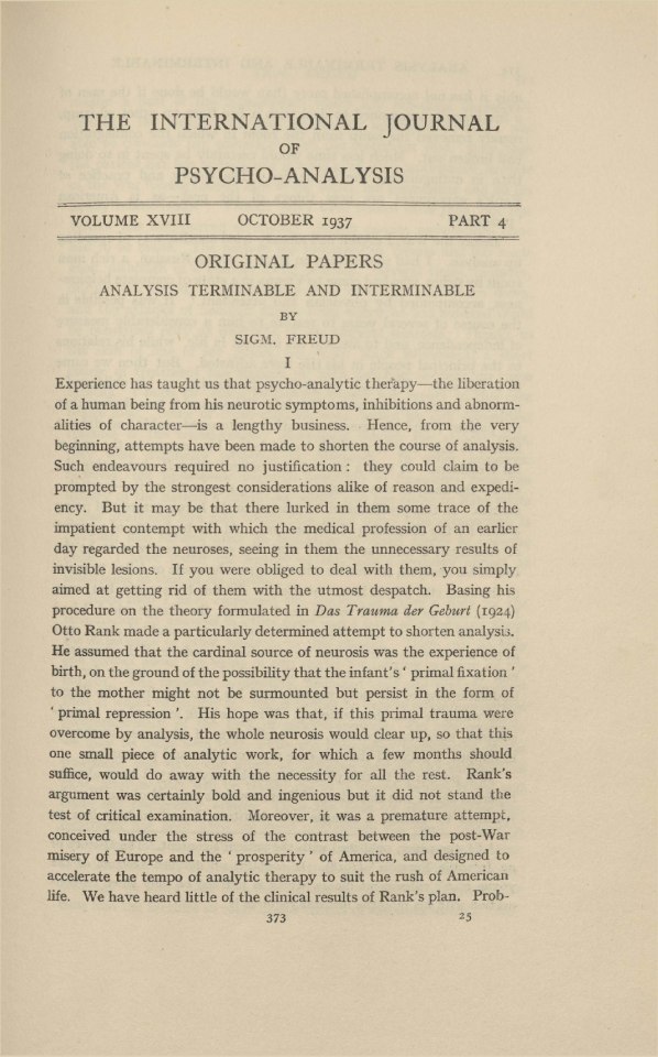 Freud, Sigmund | Riviere, Joan | 1937-001/1937.en | 10440 | Analysis terminable and interminable | The International Journal of Psycho-Analysis 18, 1937, 4 | 373–405 | Fertig ✔ | Teilweise - | Ganz fertig / zutreffend ✔ | Fehlt ✖ | Fehlt ✖ | Ganz fertig / zutreffend ✔ | ✔ | EB | ✔ | ||
