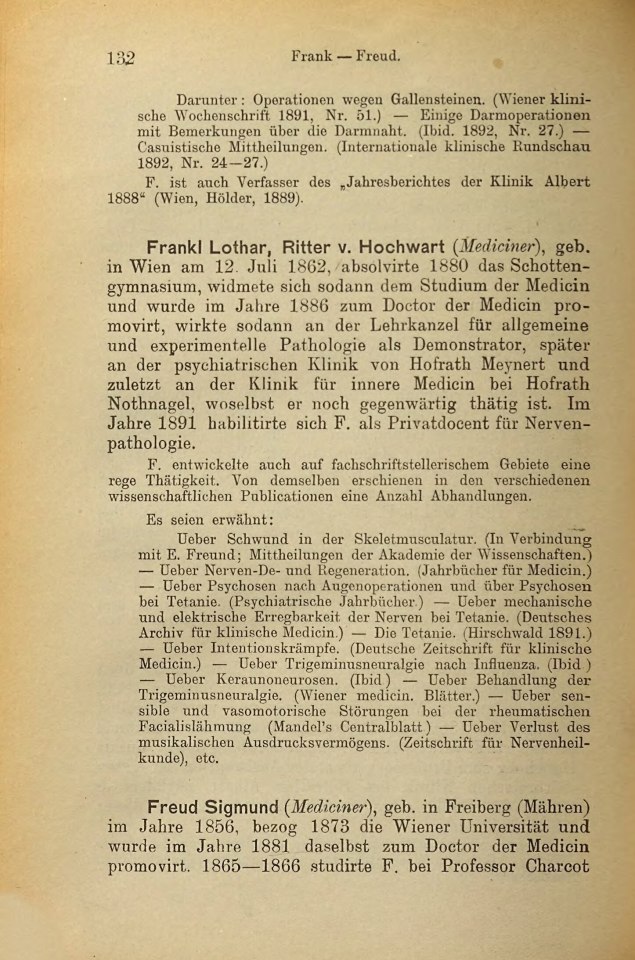 Freud, Sigmund 1893-041/1893 1893bb 1893-01 Freud, Sigmund [›Das geistige Wien‹] Eisenberg, Ludwig (Hg.): Das Geistige Wien. Künstler- und Schriftsteller-Lexikon. Zweiter Band. Medicinisch-naturwissenschaftlicher Theil, Wien: C. Daberkow 1893 132–133 Fertig Teilweise - Ganz fertig / zutreffend Fehlt Fehlt Ganz fertig / zutreffend ZB