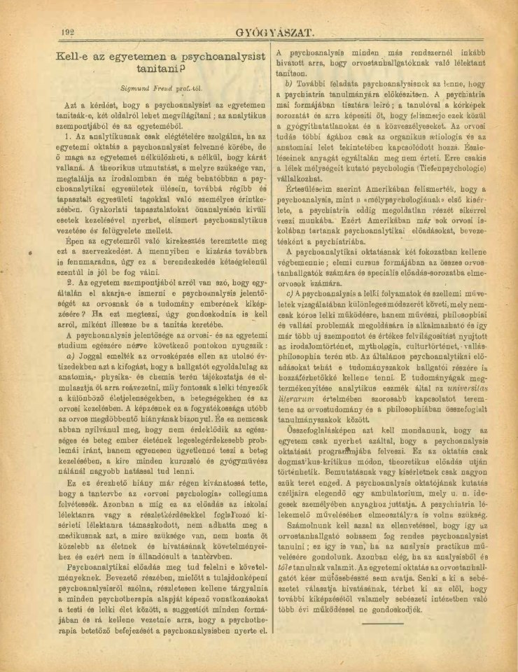 Freud, Sigmund | 1919-004/1919 | 1919j [1918] | 10494A | Kell-e az egyetemen a psychoanalysist tanítani? | Gyógyászat, 59, 1919, 13 | 192 | Fertig ✔ | Fertig ✔ | Ganz fertig / zutreffend ✔ | Fehlt ✖ | Fehlt ✖ | Ganz fertig / zutreffend ✔ | ✔ | EB | ✔ | ||