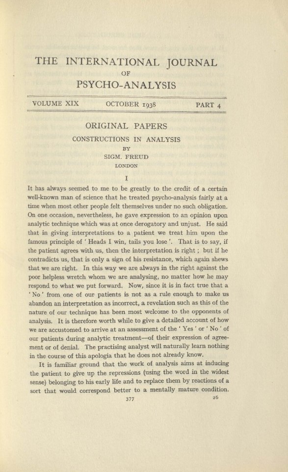 Freud, Sigmund | Strachey, James | 1937-002/1938.en | 10499 | Constructions in analysis | The International Journal of Psycho-Analysis, 19, 1938, 4 | 377–387 | Fertig ✔ | Fertig ✔ | Ganz fertig / zutreffend ✔ | Fehlt ✖ | Fehlt ✖ | Ganz fertig / zutreffend ✔ | ✔ | EB | ✔ | ||