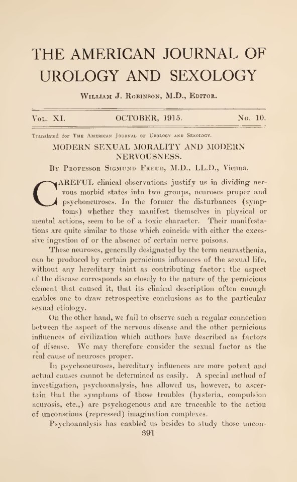 Freud, Sigmund | N. N. | 1908-003/1915.en | 10505 | Modern Sexual Morality and Modern Nervousness | The American Journal of Urology and Sexology, 11, 1915, 10 | 391–405 | Fertig ✔ | Fertig ✔ | Ganz fertig / zutreffend ✔ | Fehlt ✖ | Fehlt ✖ | Ganz fertig / zutreffend ✔ | ✔ | EB | ✔ | ||