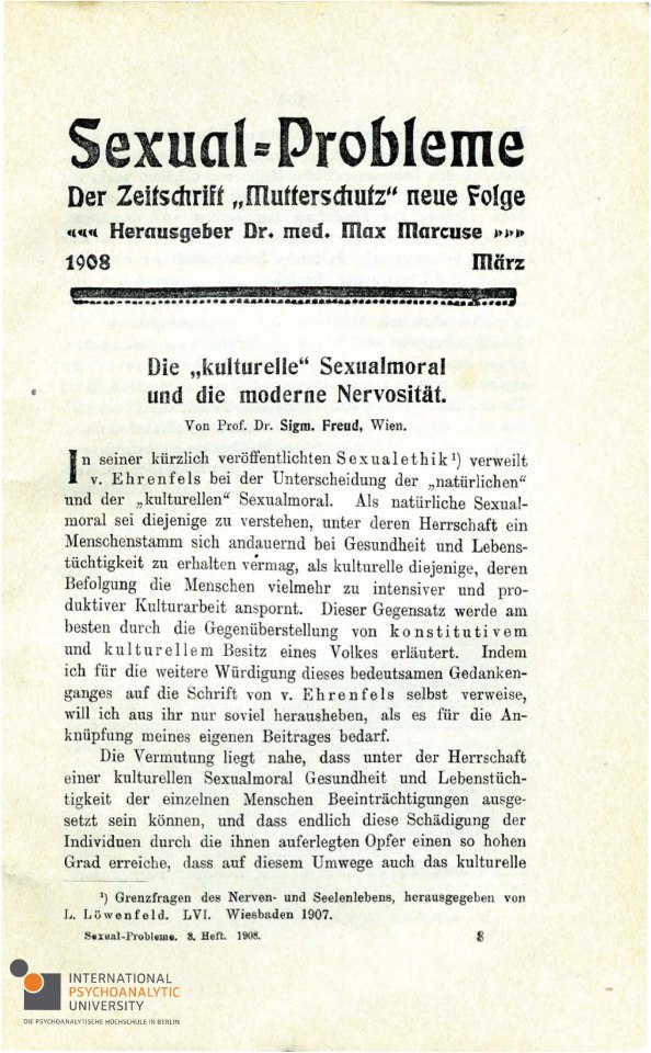 Freud, Sigmund | 1908-003/1908.1 | 1908d | 1908-03 | 10505 | Die „kulturelle“ Sexualmoral und die moderne Nervosität | Sexual-Probleme, 4, 1908, 3 | 107–129 | Fertig ✔ | Fertig ✔ | Ganz fertig / zutreffend ✔ | Fehlt ✖ | Fehlt ✖ | Ganz fertig / zutreffend ✔ | ✔ | EB | ✔ | |