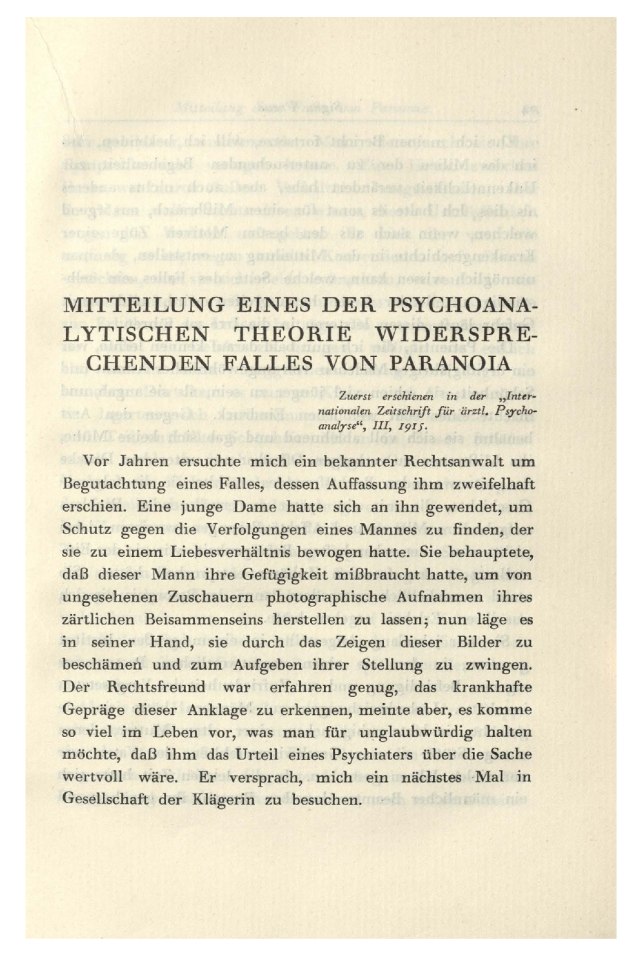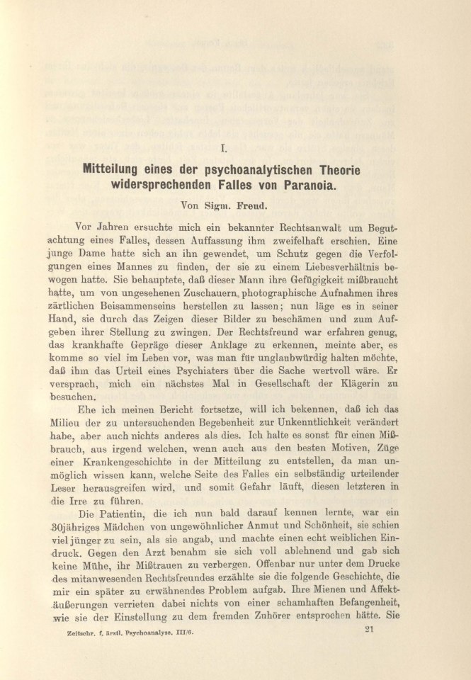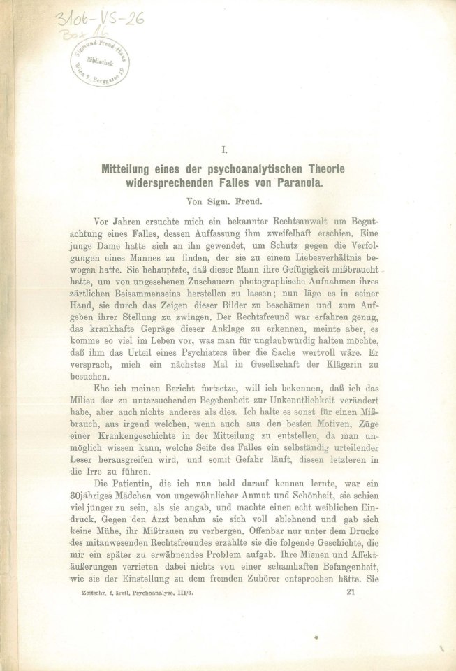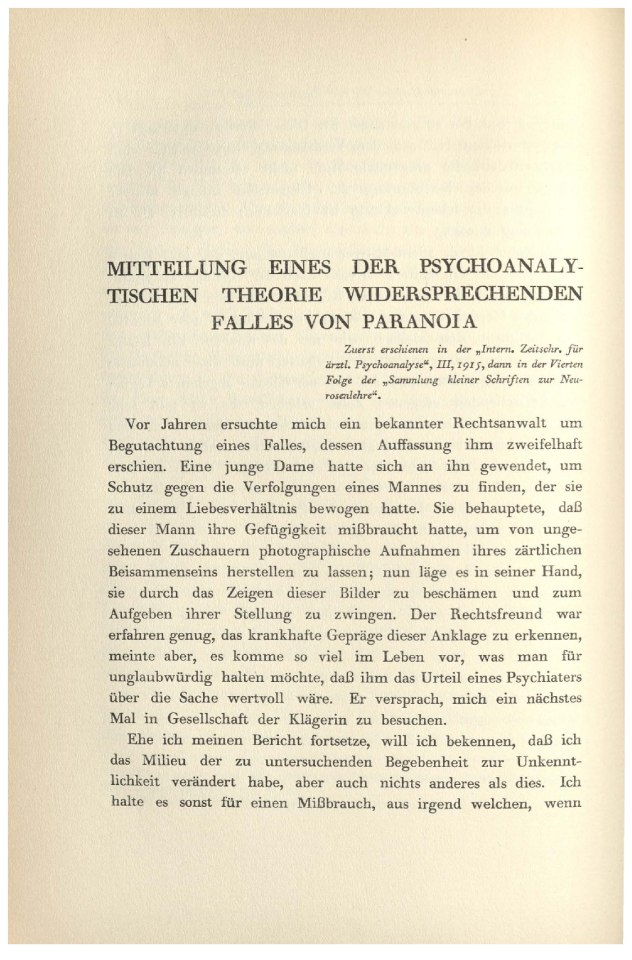 Freud, Sigmund | 1915-006/1915.2 | Mitteilung eines der psychoanalytischen Theorie widersprechenden Falles von Paranoia | Separatum IZP 3, 1915, 6 |