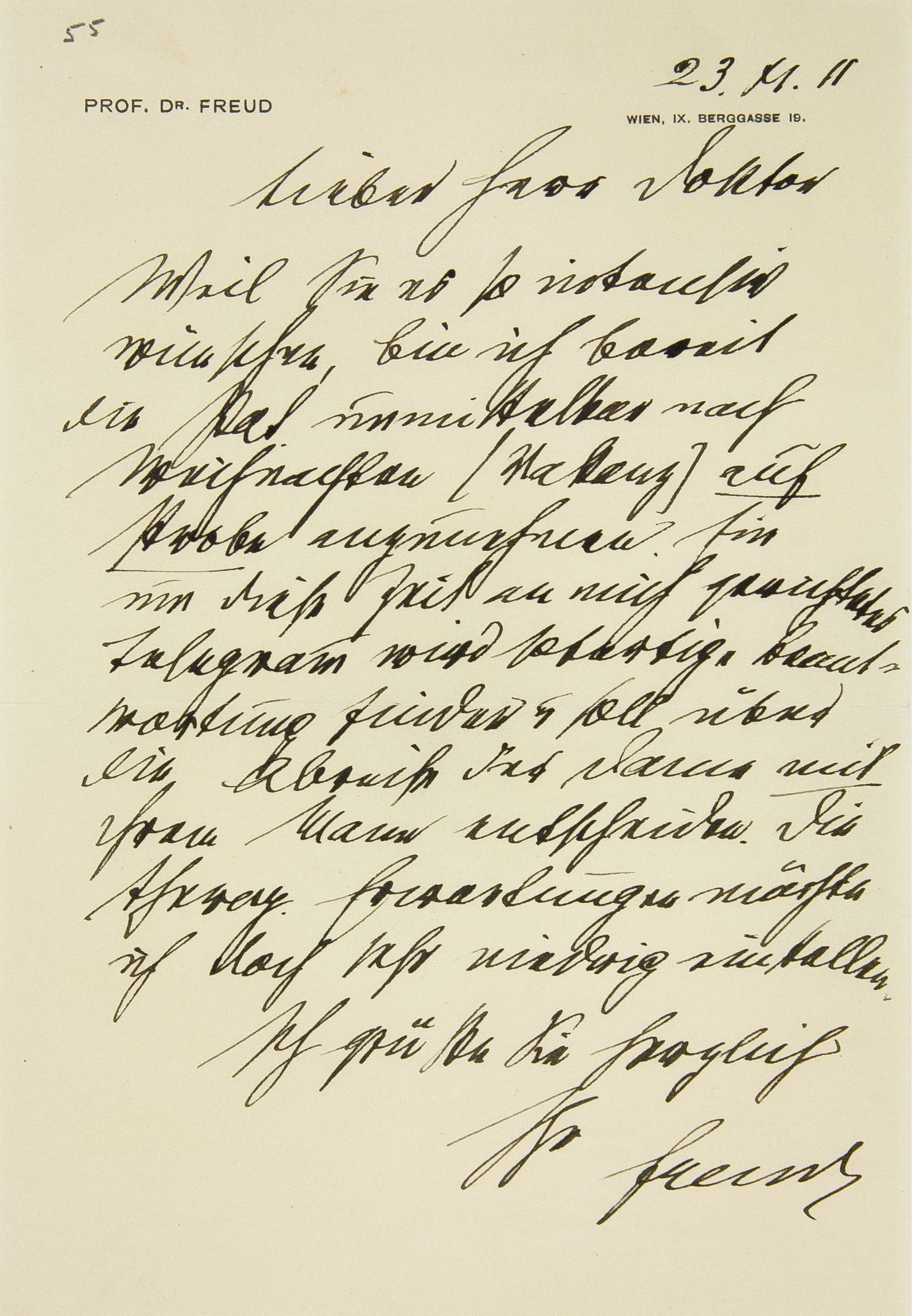 Weil Sie es so intensiv wünschen,1 bin ich bereit, die Pat. unmittelbar nach Weihnachten (Vakanz) auf Probe anzunehmen. Ein um diese Zeit an mich gerichtetes Telegramm wird sofortige Beantwortung finden und soll über die Abreise der Dame mit ihrem Mann entscheiden. Die therapeutischen Erwartungen möchte ich doch sehr niedrig einstellen.