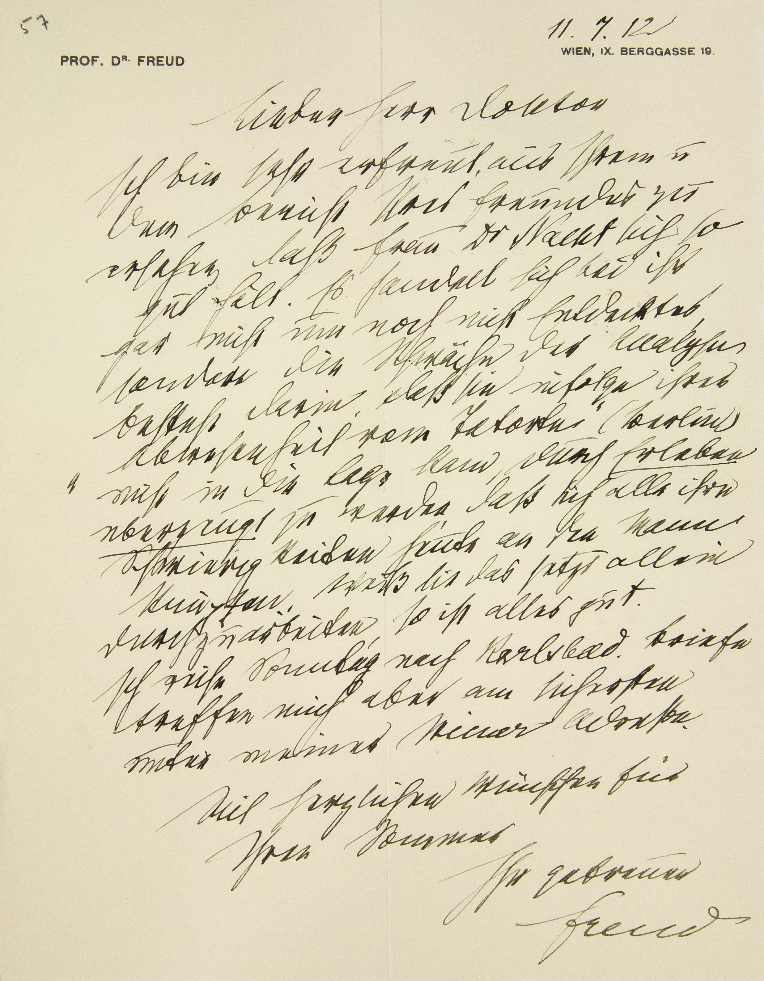 Ich bin sehr erfreut, aus Ihrem und dem Bericht Ihres Freundes zu ersehen, daß Frau Dr. Nacht sich so gut hält. Es handelt sich bei ihr gar nicht um noch nicht Entdecktes, sondern die Schwäche der Analyse besteht darin, daß sie infolge ihrer „Abwesenheit vom Tatorte“ (Berlin) nicht in die Lage kam, durch Erleben überzeugt zu werden, daß sich alle ihre Schwierigkeiten heute an den Mann knüpfen. Weiß sie das jetzt allein durchzuarbeiten, so ist alles gut.