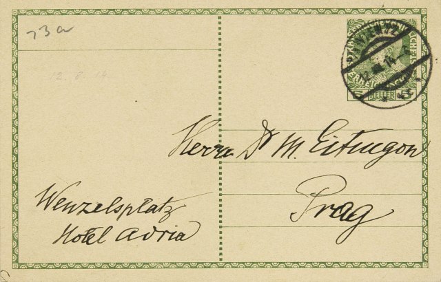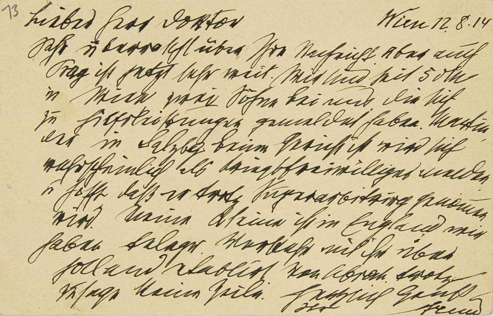 Sehr überrascht über Ihre Nachricht. Aber auch Prag ist jetzt sehr weit. Wir sind seit 5. d. M. in Wien, zwei Söhne bei uns, die sich zu Hilfsleistungen gemeldet haben. Martin, der in Salzburg beim Gericht ist, wird sich wahrscheinlich als Kriegsfreiwilliger melden und hofft, daß er trotz Superarbitrierung1 genommen wird. Meine Kleine ist in England, wir haben telegraphischen Verkehr mit ihr über Holland etabliert. Von Abraham trotz Zusage keine Zeile.