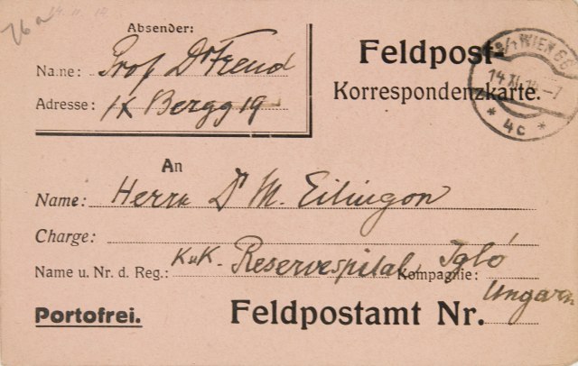 Schön, daß Sie von sich hören lassen. Von uns wenig zu sagen, zwei Söhne bei Armee, der eine viel kränklich, in Salzburg und Klagenfurt.1 Praxis fast ganz unterbrochen, ich schreibe viel.2 In Berlin und Hamburg war ich zwölf Tage; sehr erfreulich. Unsere ärztlichen Mitglieder alle beschäftigt. Landauer3 und Winterstein4 an der Front, Rank,5 Sachs,6 Reik7 erwarten die Musterung. Ferenczi8 beim 7. Honved Husaren-Regiment in Pápa. – ‚Geschichte der psychoanalytischenb Bewegung‘ ausgegeben, muß suchen, ob sich Exemplar findet. Herzliche Grüße. Bitte um weitere Nachrichten