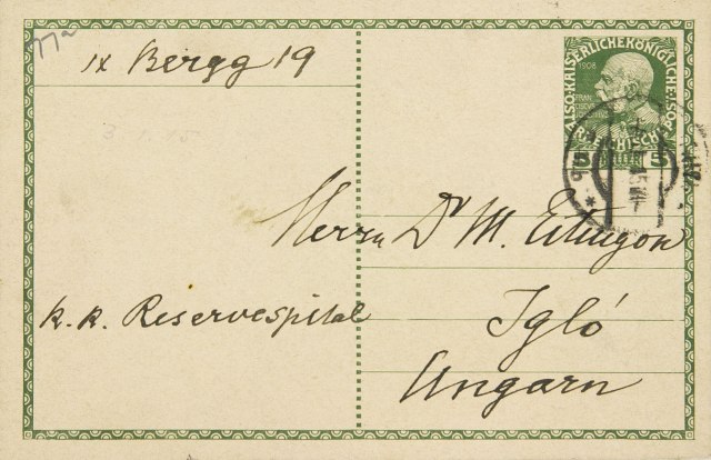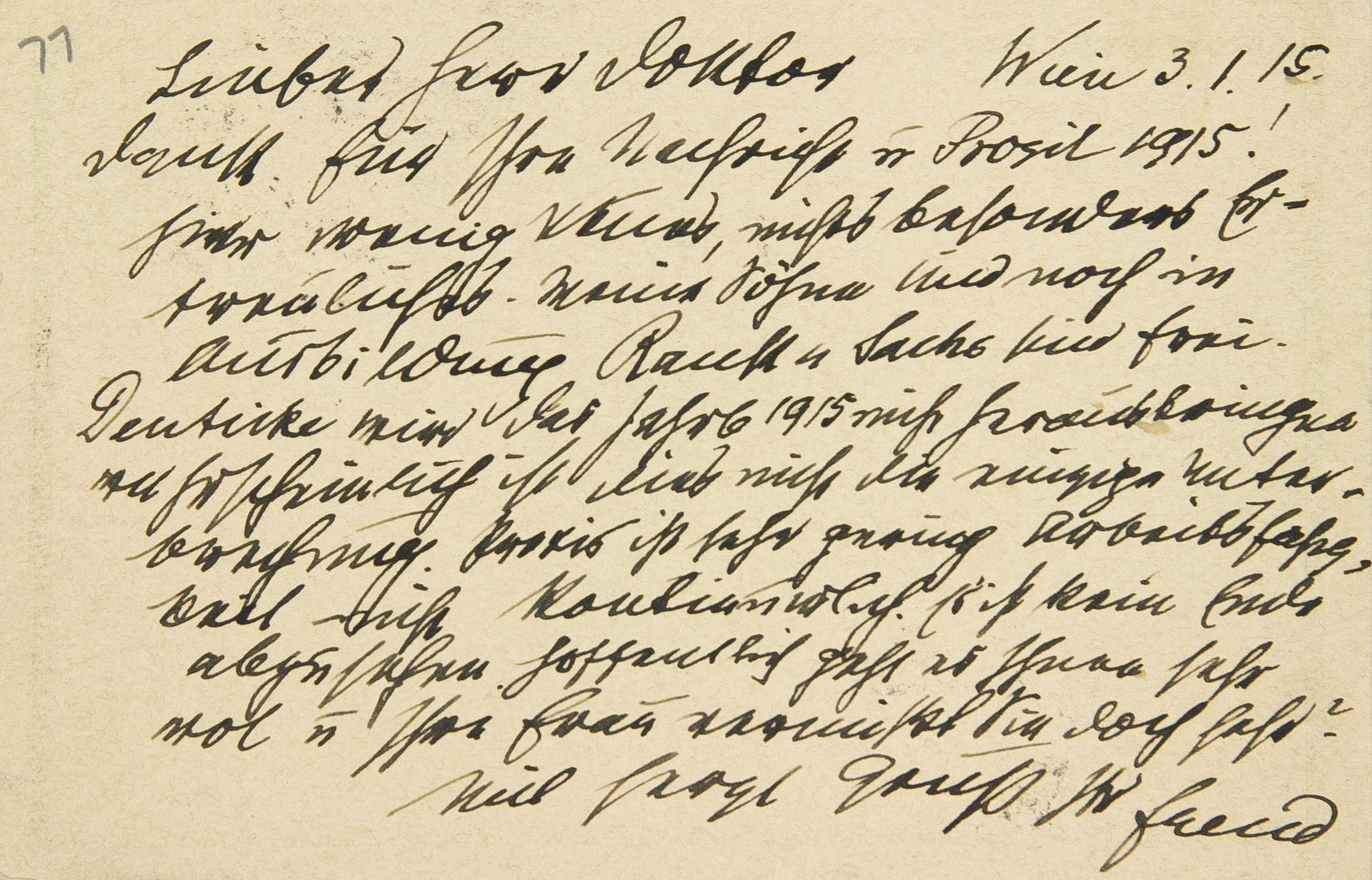 Dank für Ihre Nachricht und Prosit 1915! Hier wenig Neues, nichts besonders Erfreuliches. Meine Söhne sind noch in Ausbildung, Rank und Sachs sind frei. Deuticke1 wird das ‚Jahrbuch‘ 1915 nicht herausbringen, wahrscheinlich ist dies nicht die einzige Unterbrechung. Praxis ist sehr gering, Arbeitsfähigkeit nicht kontinuierlich. Es ist kein Ende abzusehen. Hoffentlich geht es Ihnen sehr wohl, und Ihre Frau vermißt Sie doch sehr?
