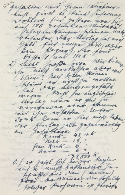 1. Fond. 5½% und absolute Sicherheit sind natürlich sehr verlockend, die Entfernung und Schwierigkeit der Verfügung stehen dagegen. Ihr Geheimnis nicht, denn wie angekündigt habe ich es bereits durchlöchert.2 Auch mein Sachverständiger3 hat mich heute im Stich gelassen, gewiß werde ich den Modus annehmen, zu dem Sie raten. Vielleicht trennt man einen kleineren Betrag bald ab, der leicht verfügbar gehalten wird. Gegen Kursverlust gibt es keine Sicherung. Dollars sind gestern von 195 auf 155 gesunken. Weitere Schwankungen scheinen unberechenbar. Der Verlag hat noch Geld für einige Zeit (aber kein Papier), der Fond besteht aus 118 K.
