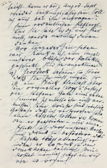 9. Groddeck.9 Bedaure zu hören, daß Sie ihn nicht mögen. Er ist ein Stück Phantast, aber ein origineller Kopf und besitzt die seltene Gabe eines guten Humors. Ich möchte ihn nicht vermissen. Seine Briefe sind prächtig. Gestehe, daß ich versprochen habe, einen köstlich tollen psychoanalytischen Roman, den er geschrieben und mir eingeschickt hat, durch unseren Verlag zum Druck zu befördern. Das Risiko trägt allerdings er, indem er 20.000 Mk zu den Druckkosten beiträgt. Soviel kostet nämlich jetzt ein Buch von 20 Bogen!