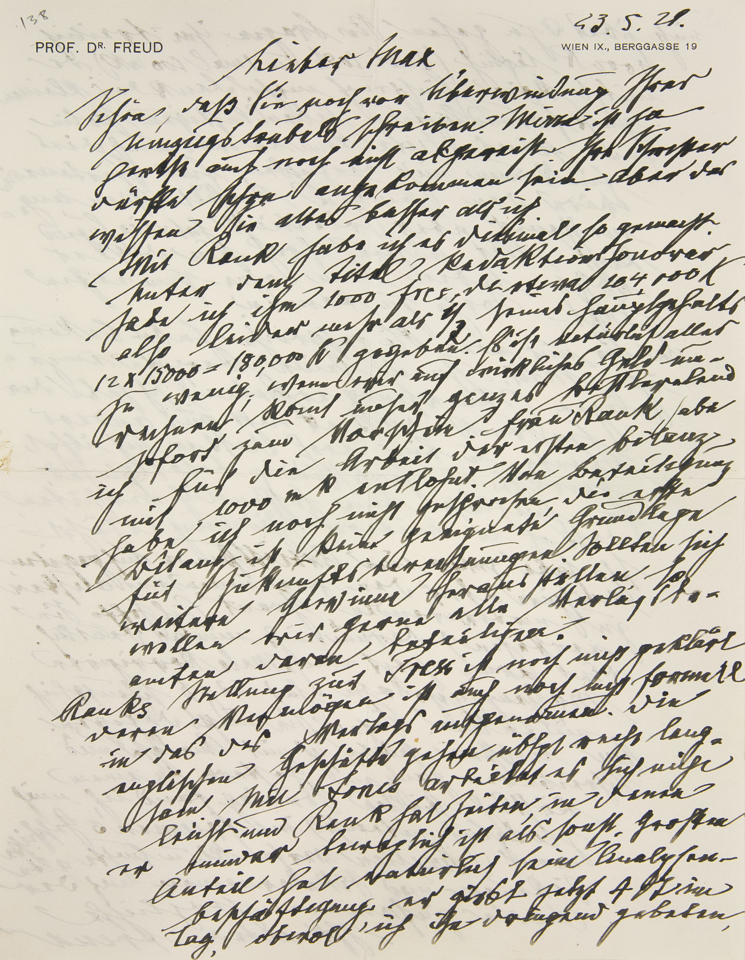 Mit Rank habe ich es diesmal so gemacht: Unter dem Titel Redaktionshonorar habe ich ihm 1000 frcs1, d. i. etwa 104.000 K, also leider mehr als die Hälftea seines Hauptgehalts 12 x 15.000 = 180.000 K gegeben. Es ist natürlich alles zu wenig; wenn wir auf wirkliches Geld umrechnen, kommt unser ganzes Bettlerelend sofort zum Vorschein. Frau Rank habe ich für die Arbeit [an] der ersten Bilanz mit 1000 Mk entlohnt. Von Beteiligung habe ich noch nicht gesprochen, die erste Bilanz ist keine geeignete Grundlage für Zukunftsberechnungen. Sollten sich weitere Gewinne herausstellen, so wollen wir gerne alle Verlagsbeamten daran beteiligen.