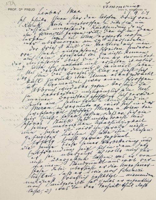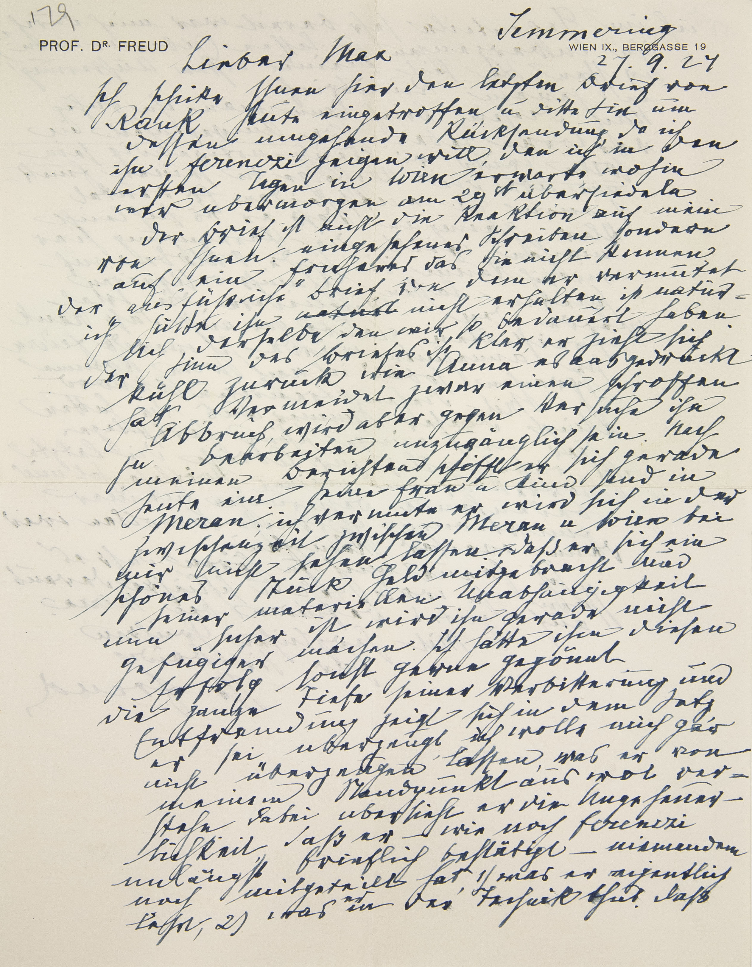 Ich schicke Ihnen hier den letzten Brief von Rank, heute eingetroffen,1 und bitte Sie um dessen umgehende Rücksendung, da ich ihn Ferenczi zeigen will, den ich in den ersten Tagen in Wien erwarte, wohin wir übermorgen, am 29., übersiedeln.