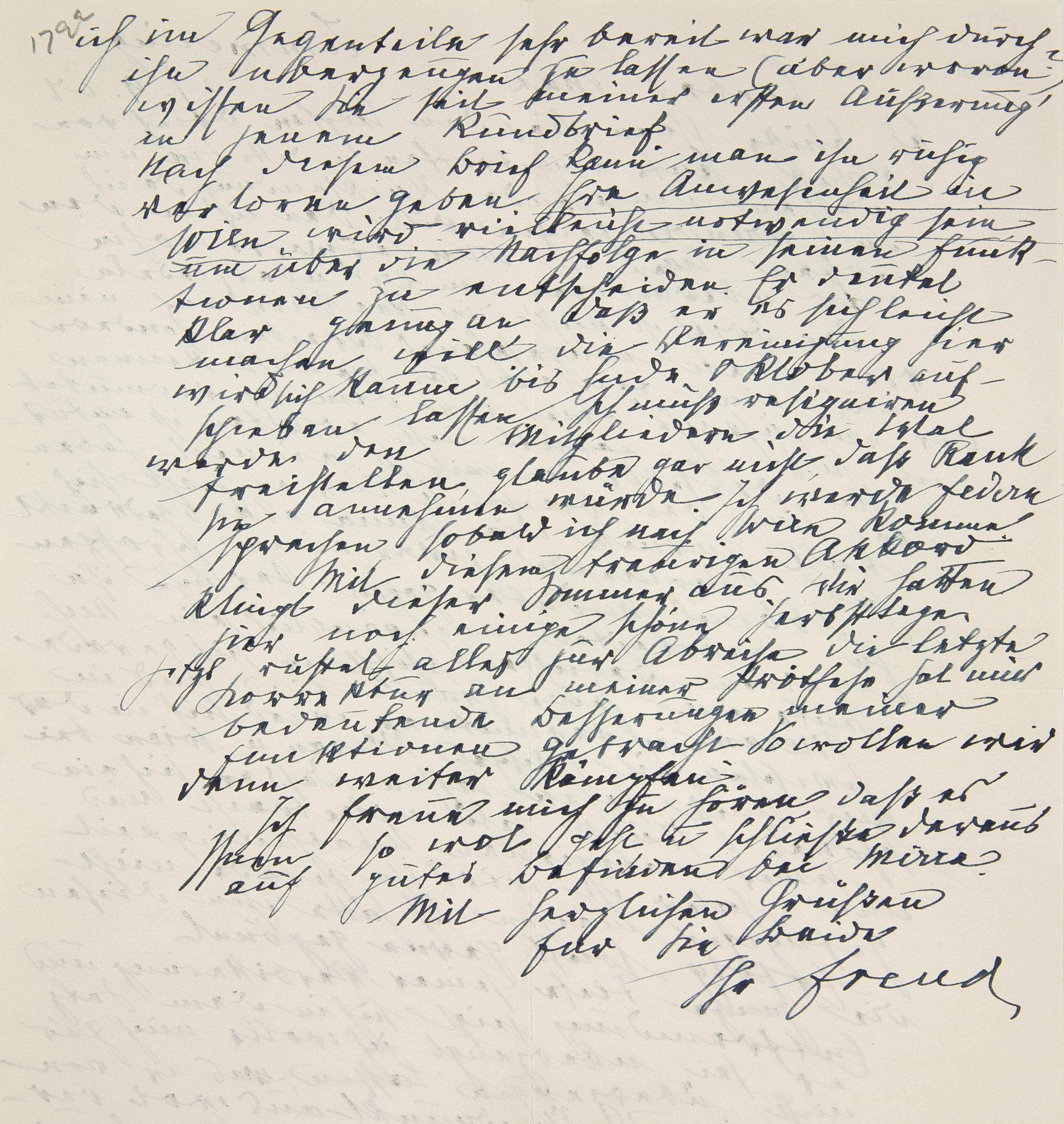 Der Brief ist nicht die Reaktion auf mein von Ihnen eingesehenes Schreiben, sondern auf ein früheres, das Sie nicht kennen.2 Der „ausführliche“ Brief, von dem er vermutet, ich hätte ihna nicht erhalten, ist natürlich derselbe, den wir so bedauert haben. Der Sinn des Briefes ist klar, er zieht sich kühl zurück, wie Anna es ausgedrückt hat. Vermeidet zwar einen schroffen Abbruch, wird aber gegen Versuche, ihn zu bearbeiten, unzugänglich sein. Nach meinen Berichten schifft er sich gerade heute ein. Seine Frau und Kind sind in Meran; ich vermute, er wird sich in der Zwischenzeit zwischen Meran und Wien bei mir nicht sehen lassen. Daß er sich ein schönes Stück Geld mitgebracht und seiner materiellen Unabhängigkeit nun sicher ist, wird ihn gerade nicht gefügiger machen. Ich hätte ihm diesen Erfolg sonst gerne gegönnt.